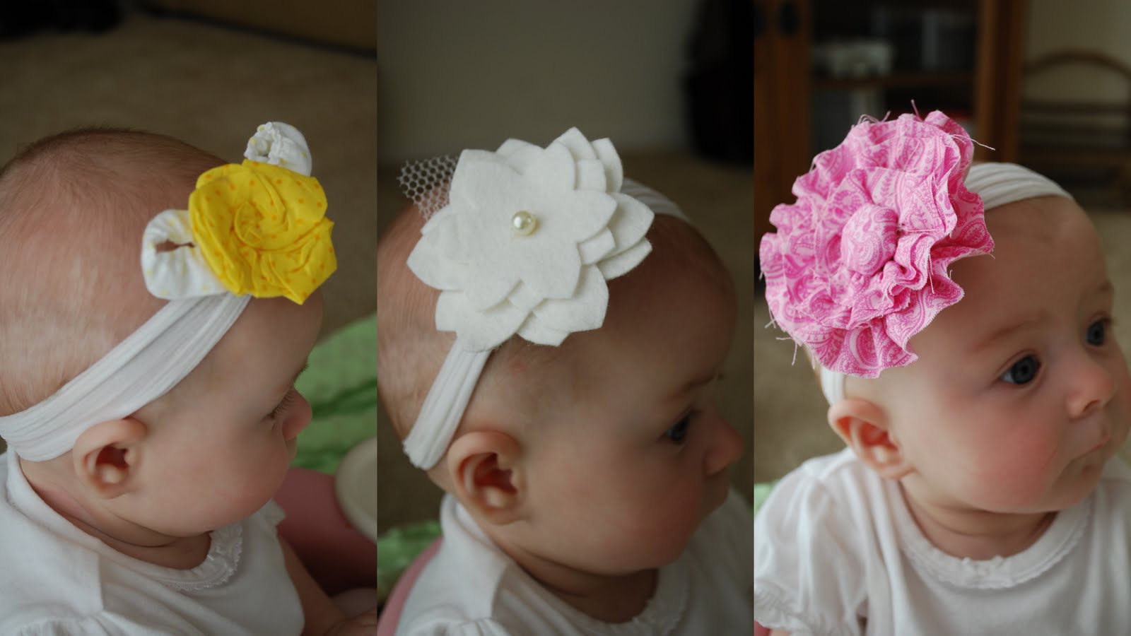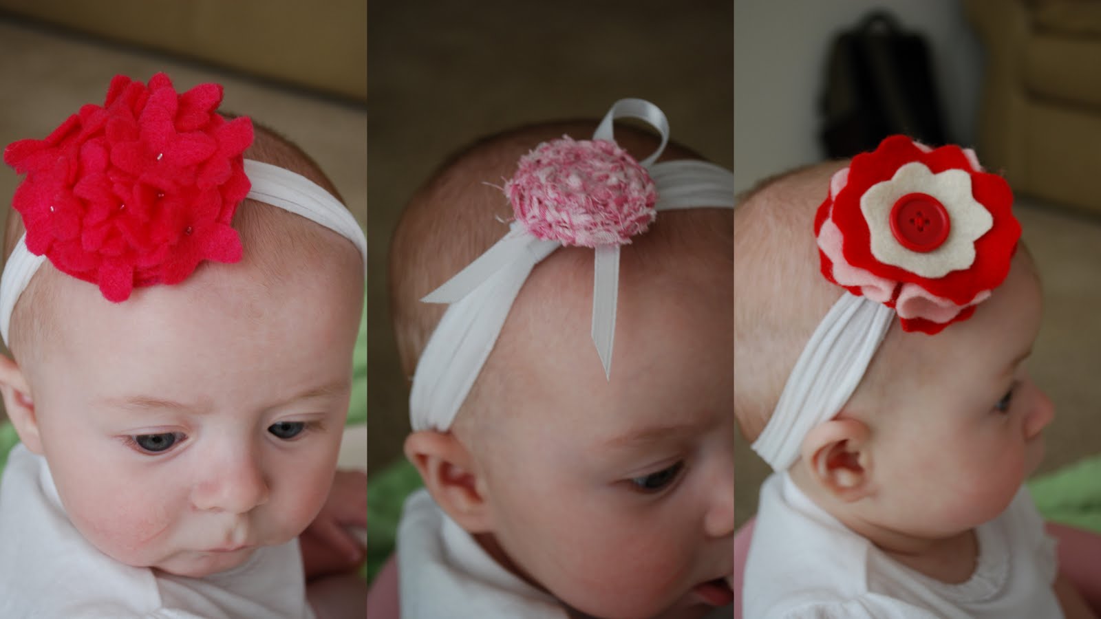 Most of them are sewn by hand using wool felt, fabric, and ribbon. Oh and tulle- every baby needs some tulle. Then I just got some plain metal clips, covered them with ribbon and hot glued them to the bow. Interchangeable!