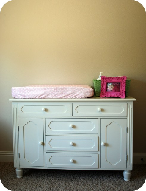 Anyway, we have never actually had a dresser/changing table for Isabelle. In our Sandy apartment, there just wasn’t room, and we put the changing pad on the spare bed in the nursery. Or the kitchen. Or the floor. Then we moved, then we were homeless, then we moved again. And on the List of Stuff to Do to the New House, it just hasn’t made the top of the list. Most dressers we have looked at are between $400 and $1000, especially the ones that match the crib we have. I have been scouring Craigslist for months and months waiting for a perfect find to pop up.