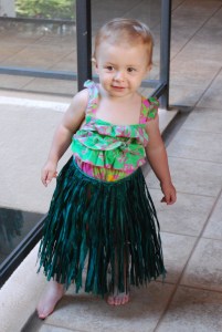 Tiny grass skirt. Miss Saucy refused to wear the coconuts or the shell necklace. Typical Isabelle.