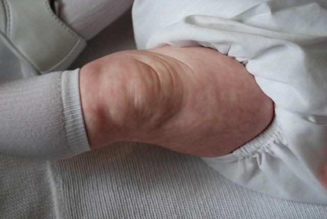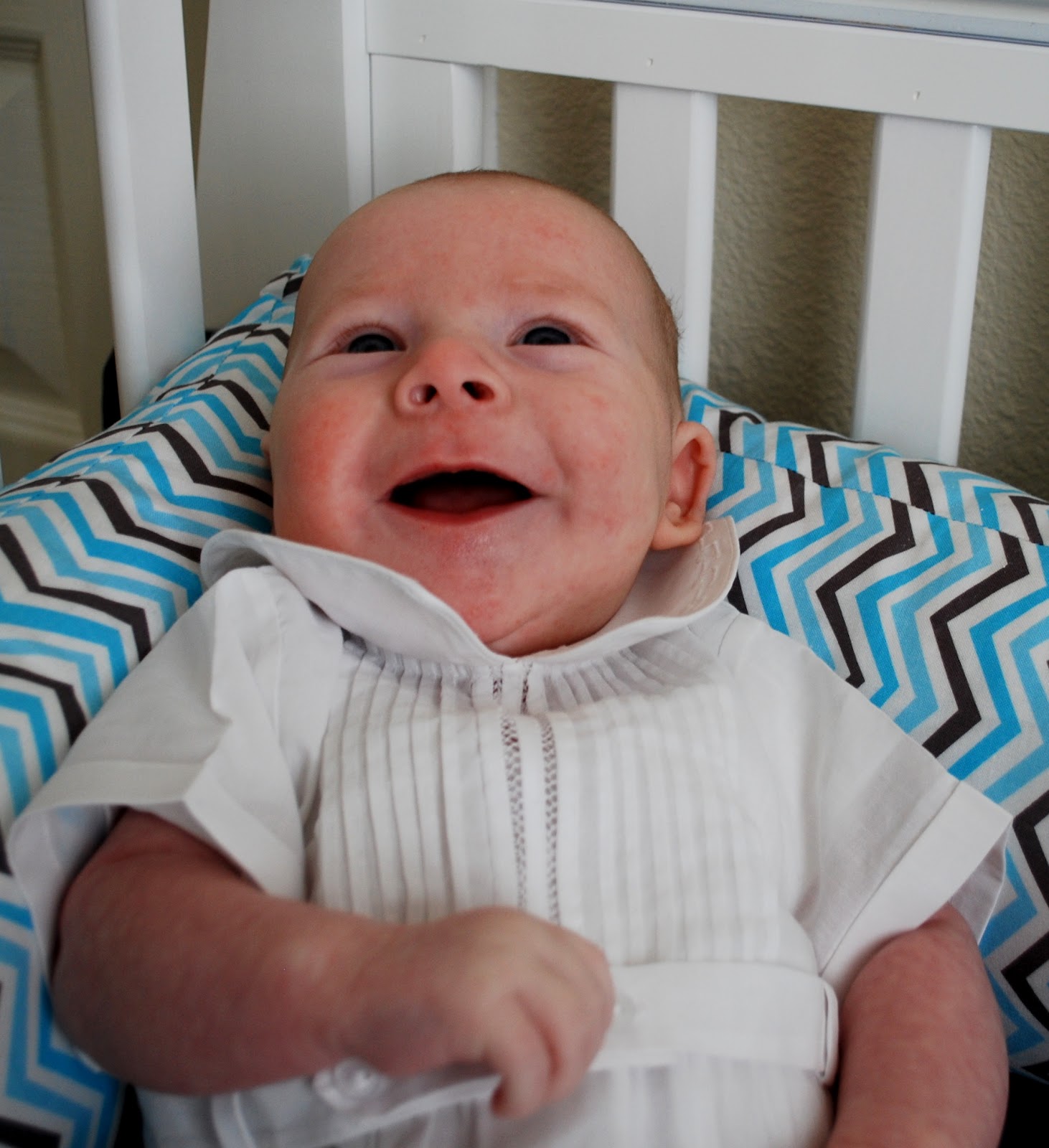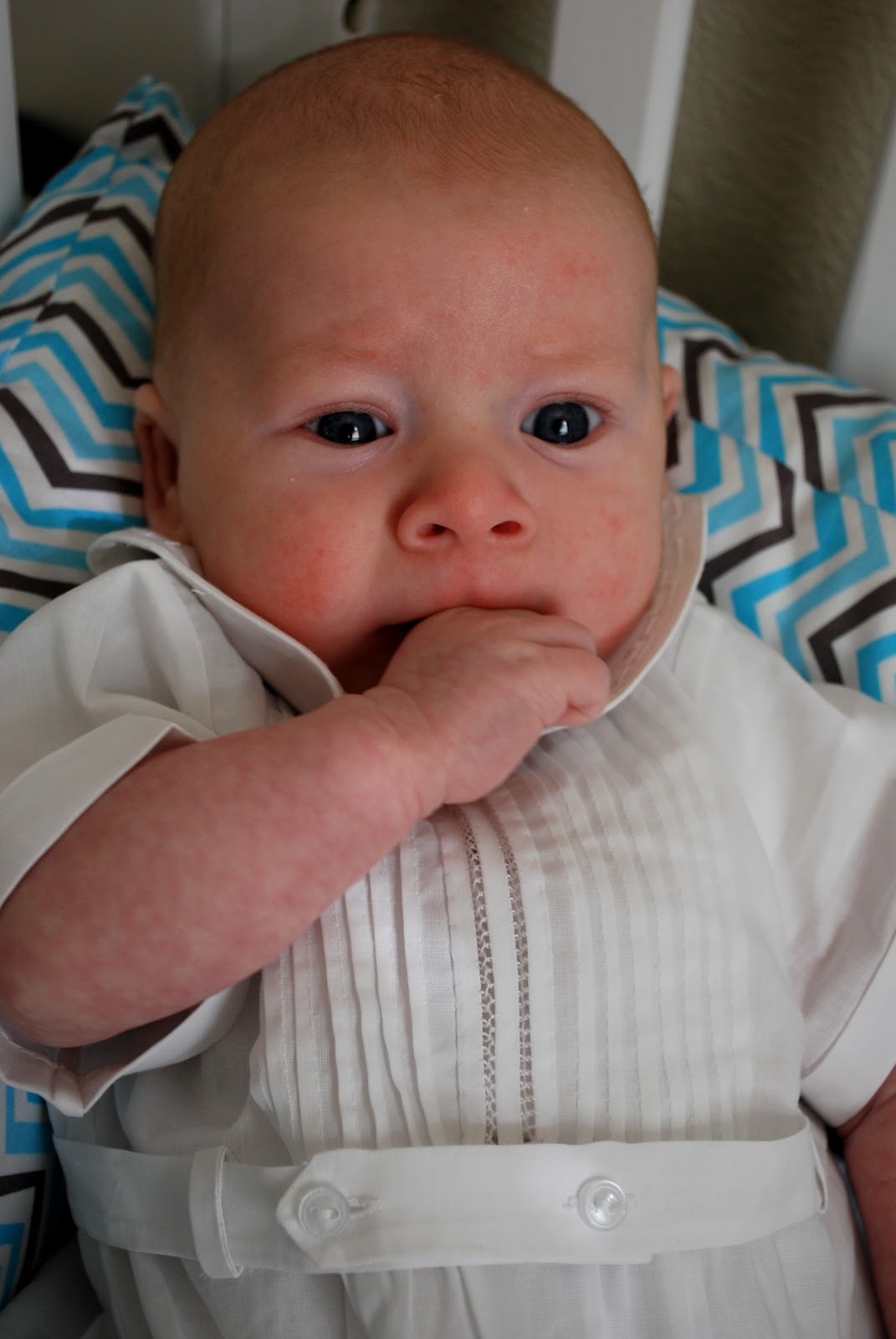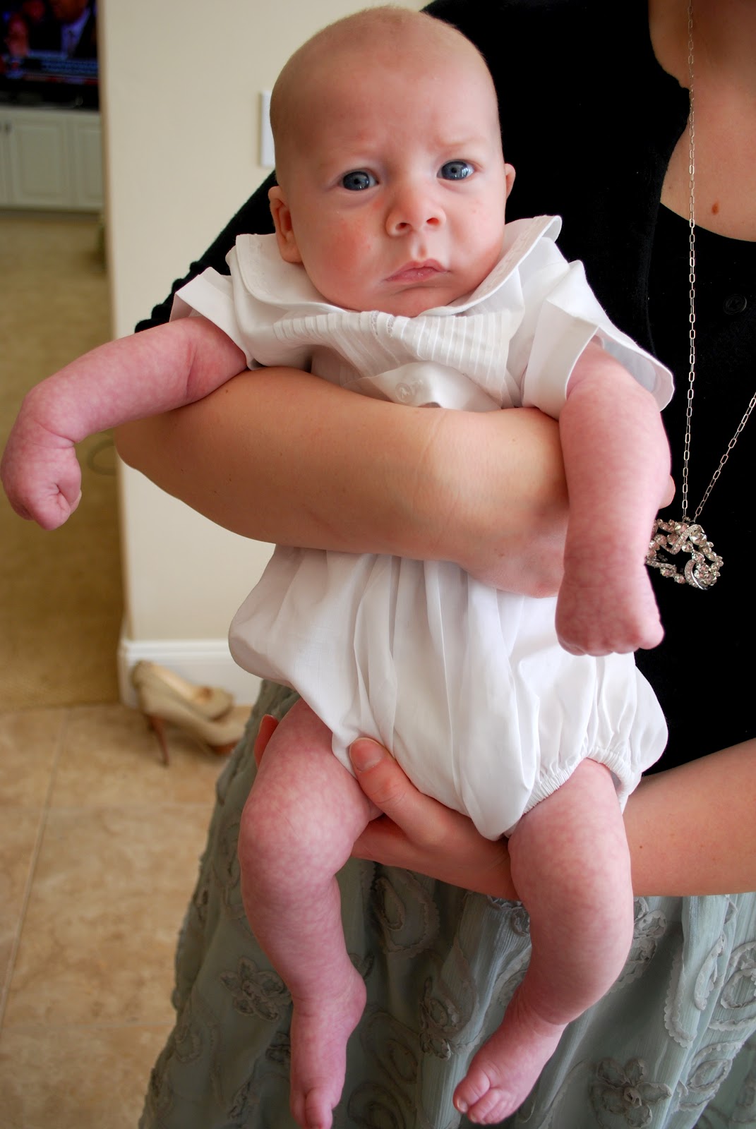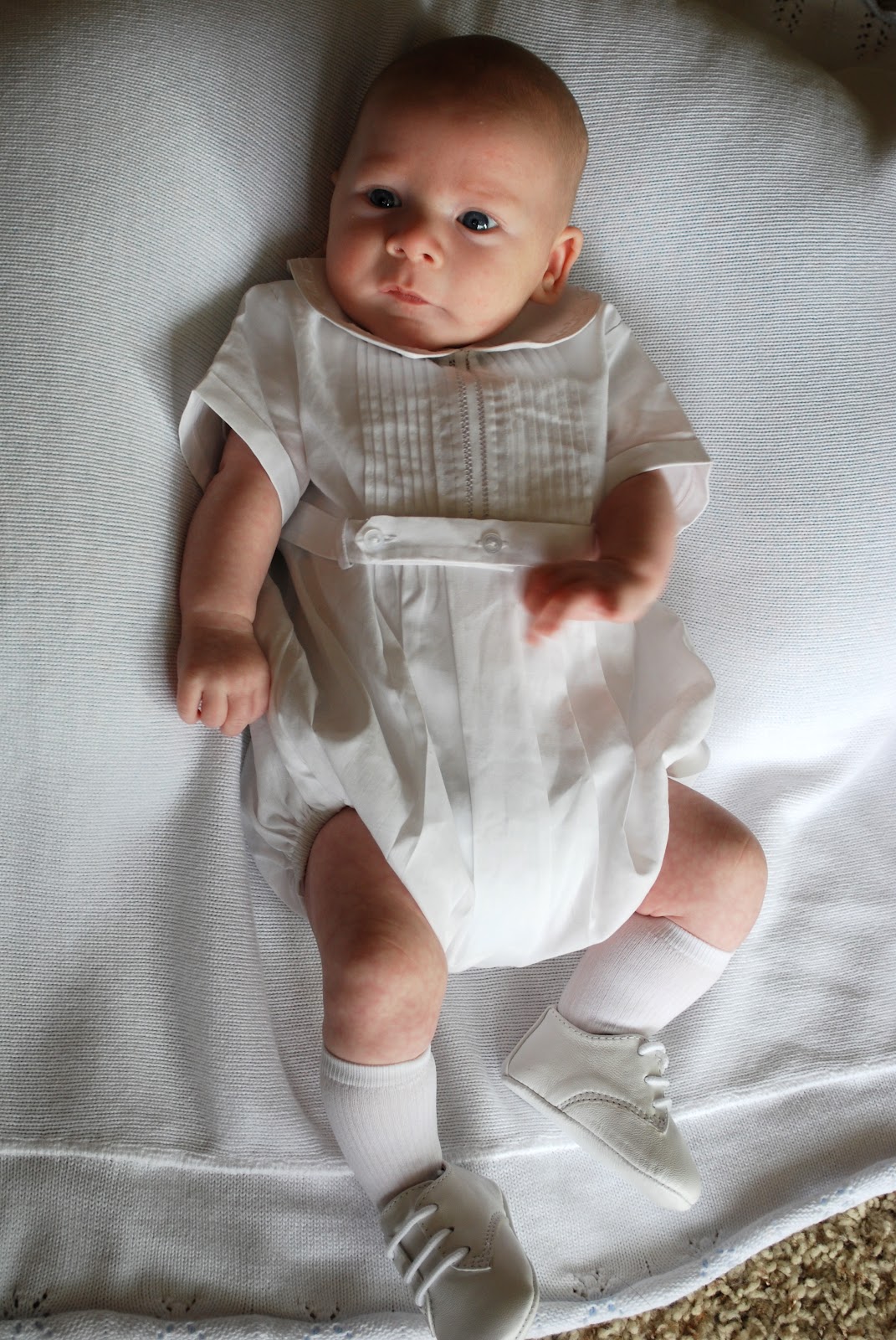 Love his romper, and socks, and the shoes. Why don't new babies wear shoes any more? They make the whole outfit.He is a mirror image of his sister. So cute.