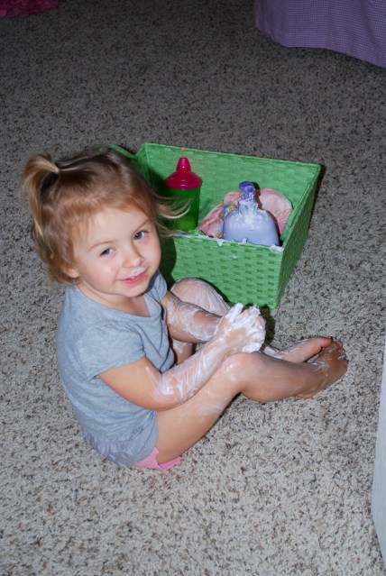 Ten minutes later, I hear her door open. She’s up. I confiscate Olivia and Leilani for a two minute time out. She isn’t supposed to get out of bed.