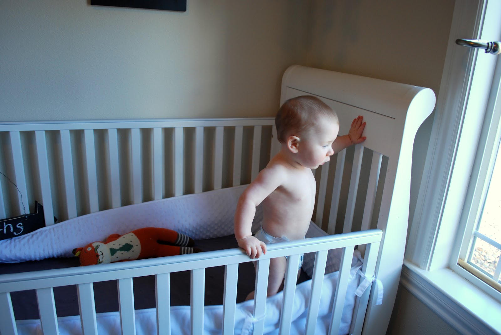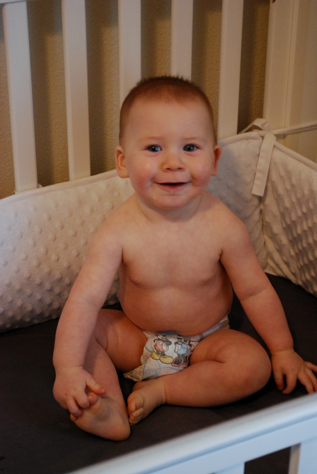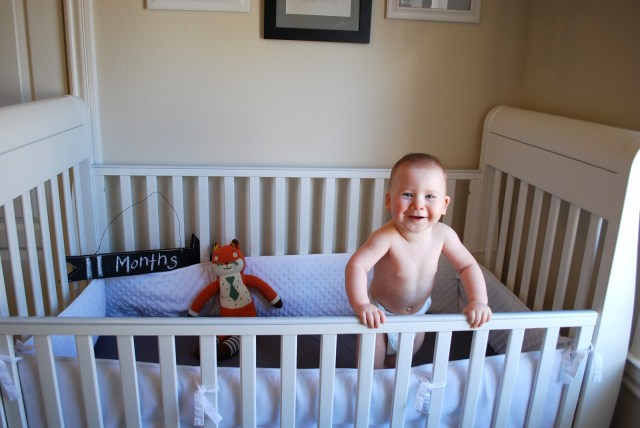 He is on a pretty good schedule now, napping once in the morning and once in the afternoon. Maybe the best thing this month is that he is putting himself to sleep. YAY. Just makes some noise and talks to himself for a few minutes then he is out, usually on his tummy in a super cute downward dog position. Normally he sleeps so well all through the night but he had a flu shot and now he sucks at sleeping. Isn’t that always the case? Last night was better, so here’s hoping it was just the shot.