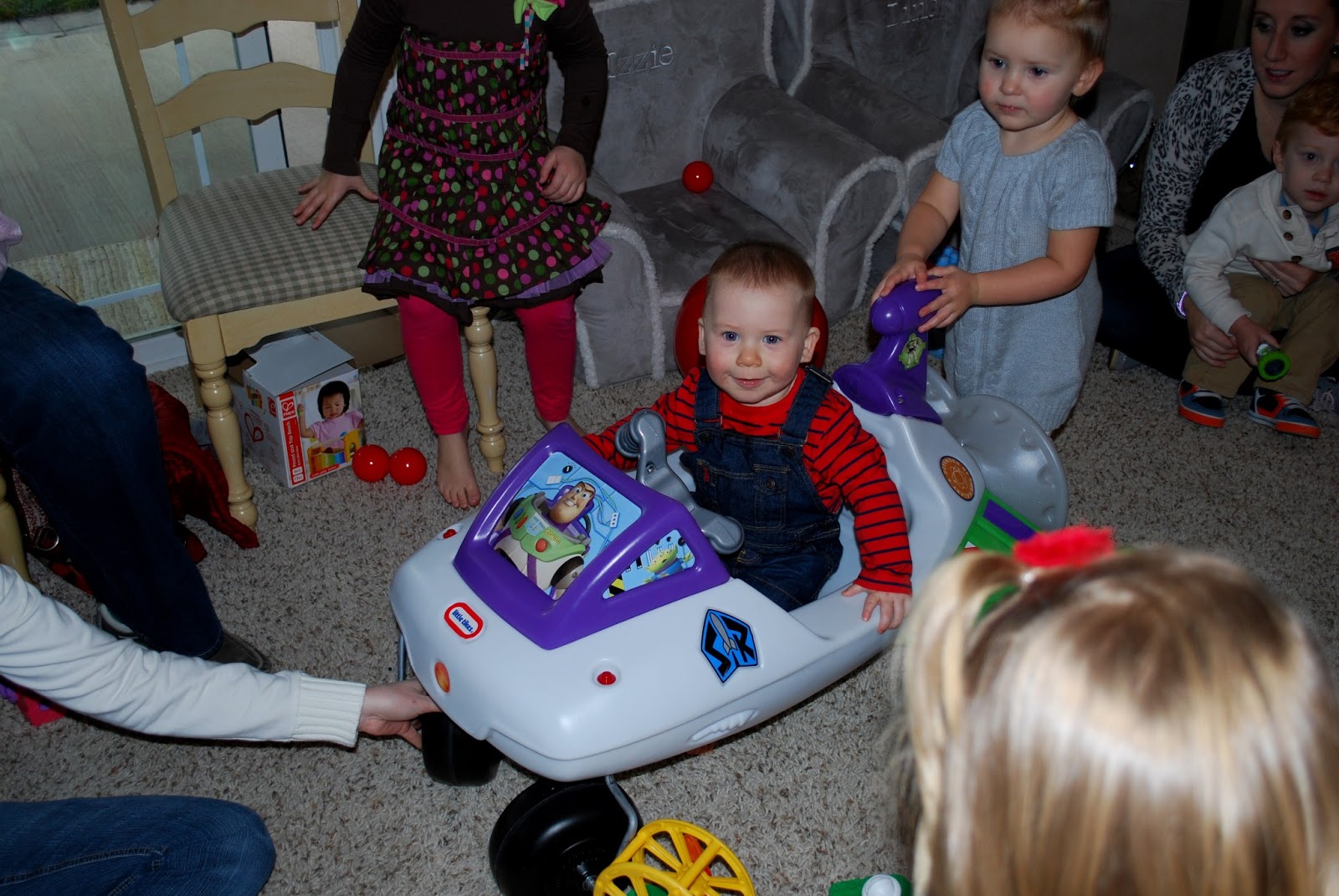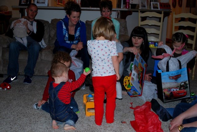 Everybody ate for awhile and enjoyed the treats and meatballs before we opened some presents. Lincoln was about one percent interested in unwrapping gifts, he mostly wanted to sit in his grey chair and observe.