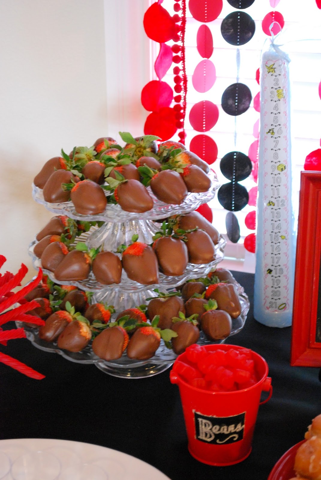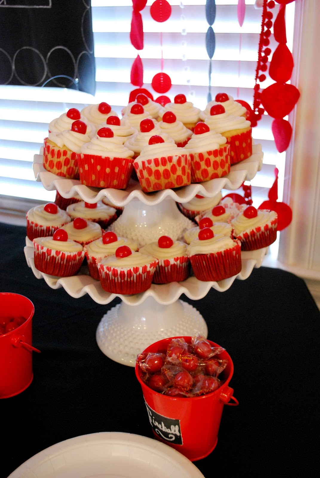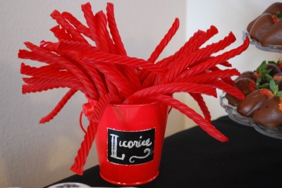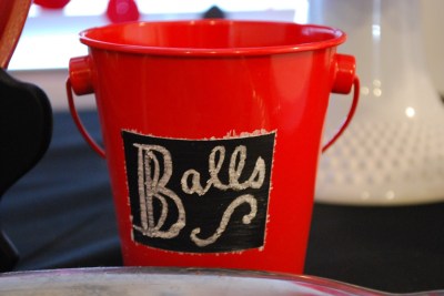 | favors: giant red jawbreakers and some other circular candy. My fav part is the ball ribbon closure. Kids also got to take home a punching balloon and a red beachball. |