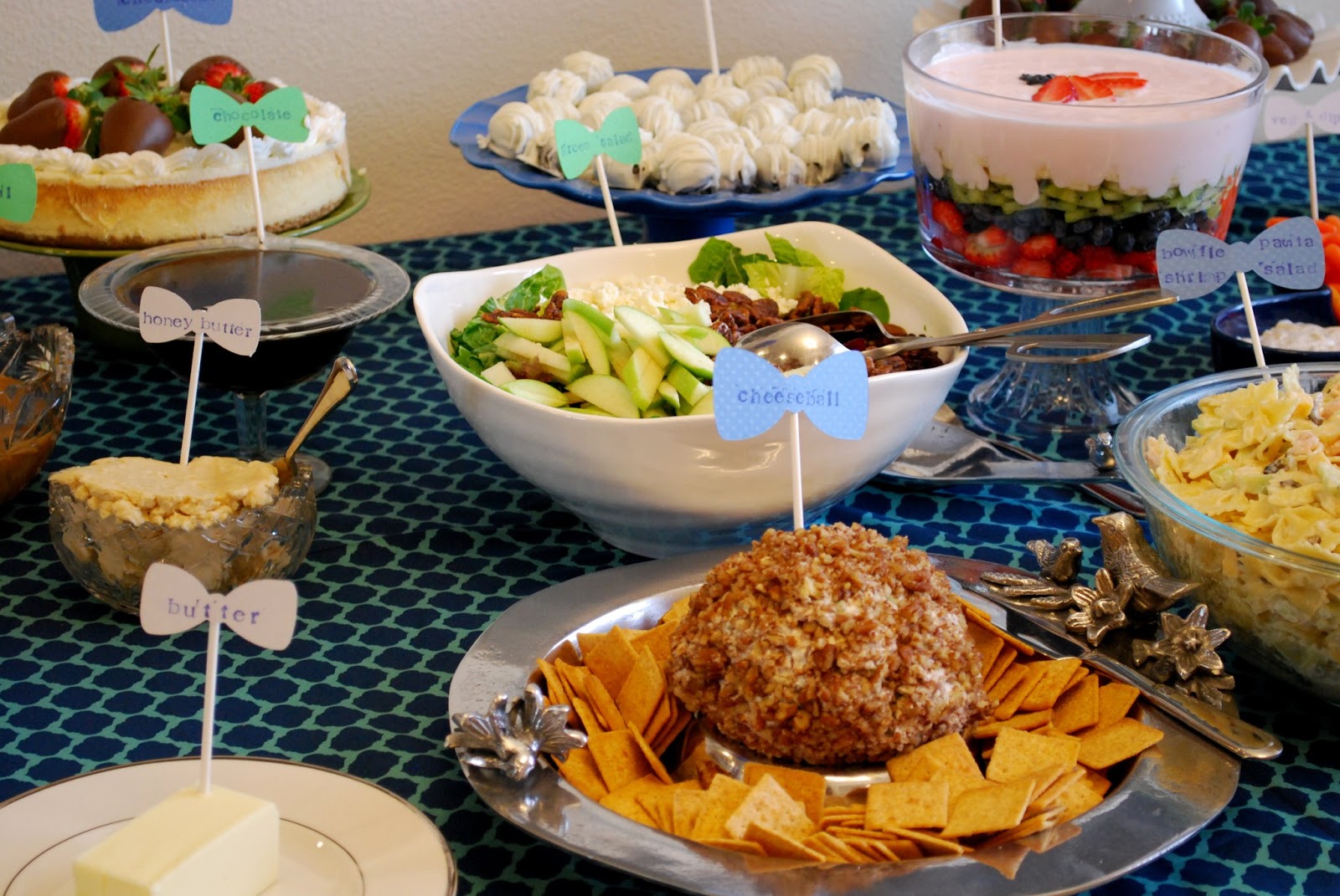 | We had bowtie pasta salad (get it!), cheeseball, big fruit salad (lanny), fresh homemade rolls (mom), chocolate strawberries… |
