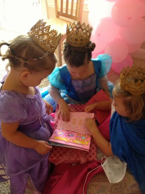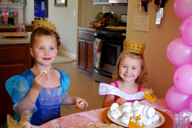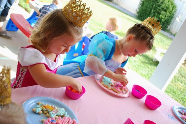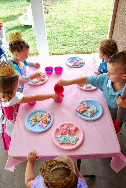 We tried to play musical spots but oh man it was so funny- lasted like a half round and the kids were like ummmm we want to eat and go outside, thanks. We did decorate crown cookies though. Make it pink! Make it blue!