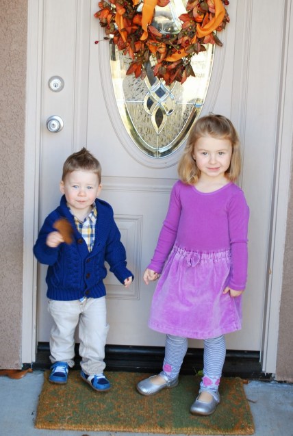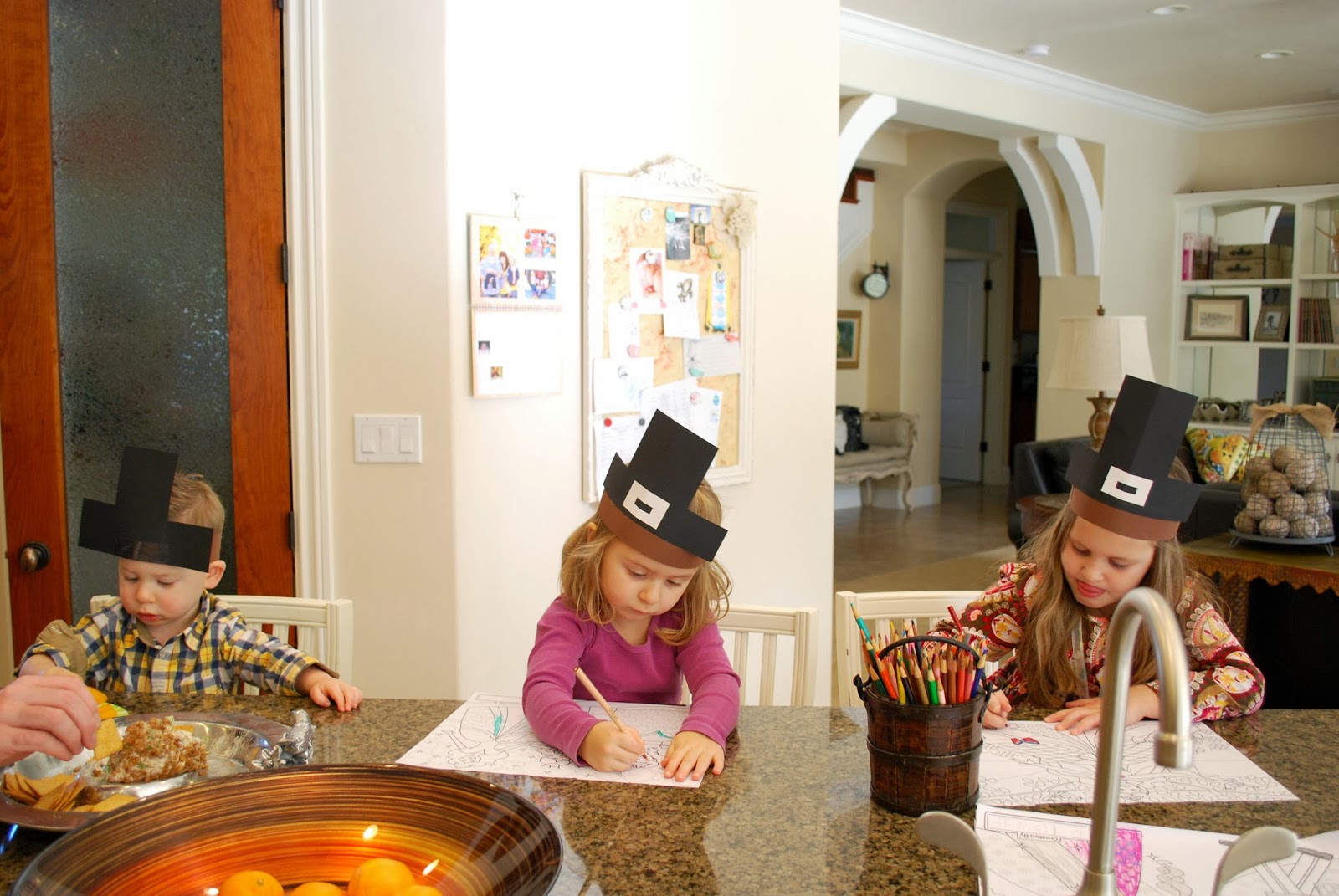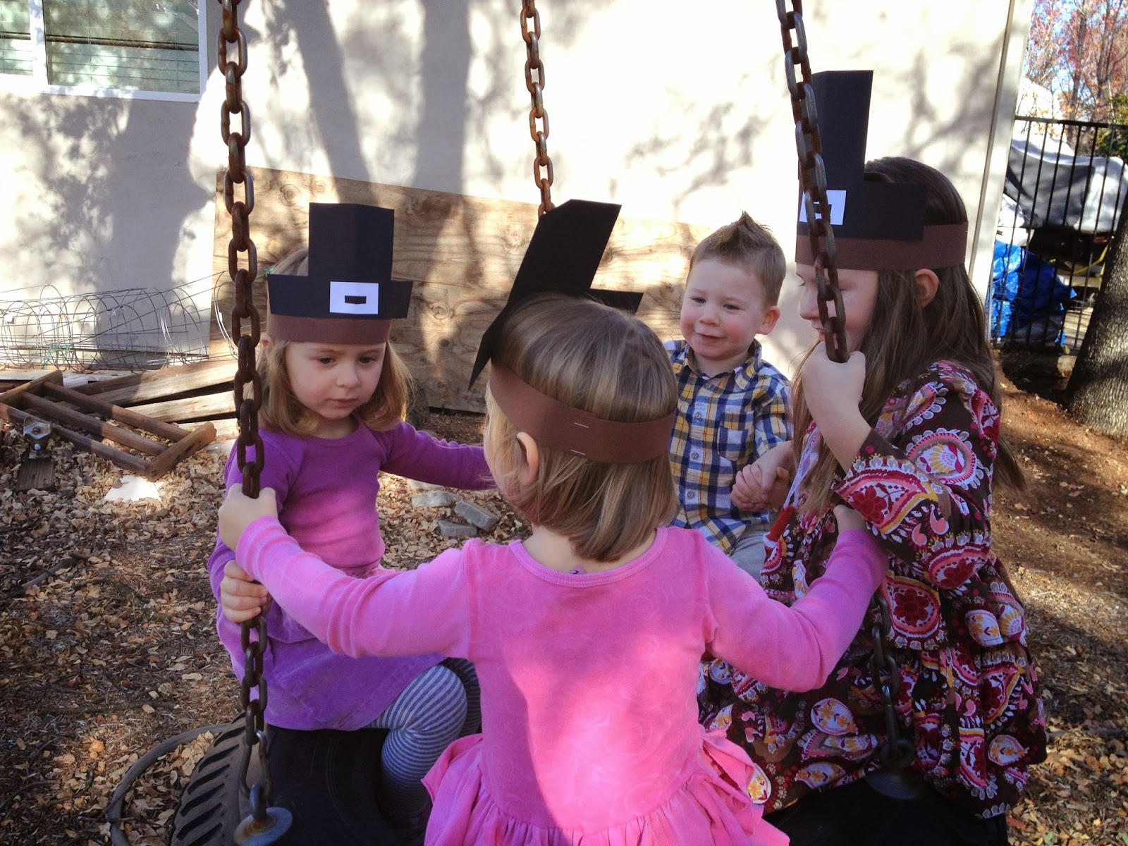 So, lemme tell you bout these hats. The three girls got pilgrim hats, the two boys got indian hats, courtesy of politically correct Grandma. Lincoln put his on, went outside and realized OH MY WORD MY HAT IS DIFFERENT I CAN’T BREATHE UNTIL I FIX IT. Huge fit. I was trying to figure out what happened as he ran in sobbing his face off and of course, it was the hat. So I made him a less than spectacular pilgrim hat with some tape and he was thrilled.Â