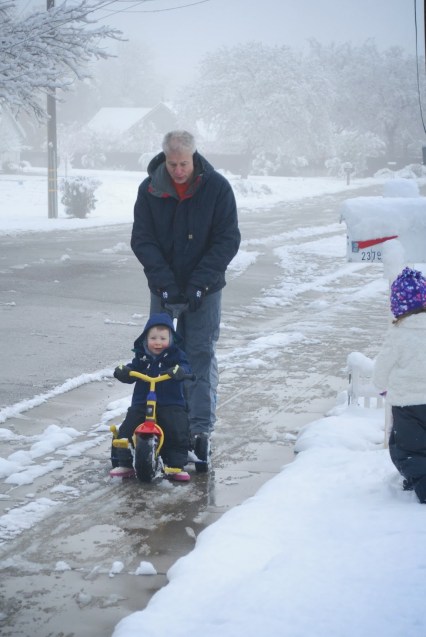 She was so happy. I was happy FOR her. Isabelle is so fun to play with- age 4 is a good one- she is her own person and the stuff she says is all quotable. Her face was just pure JOY playing in the snow and we would have stayed out there all day with her if we could have. Izzie made snow angels and snow piles and threw snow balls and eventually constructed a snow man and his snow dog. Mom and Dad came over in their snow stuff and everyone just rolled around and reveled in it until we were too cold and we went inside for hot chocolate. (Mom: “Hey Mic, I have some hersheys bars in my purse just throw those in the pot.”)Â