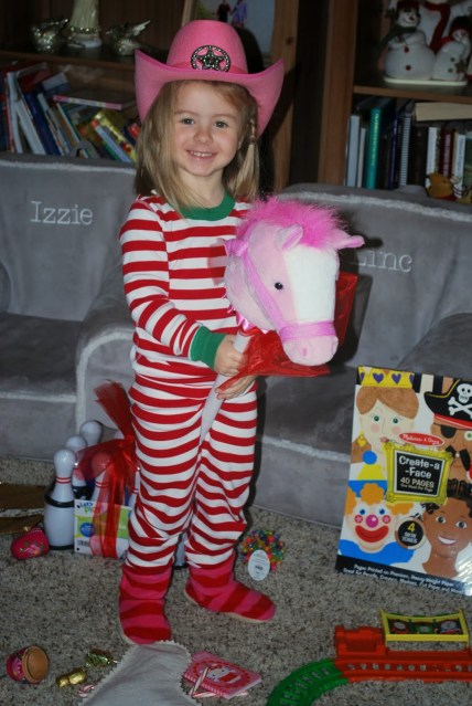 Isabelle wanted a pink pony that she could ride, that was number one on her list. She was SO EXCITED that Santa came through for her. Complete with a hat.Â