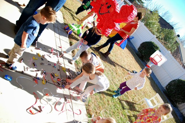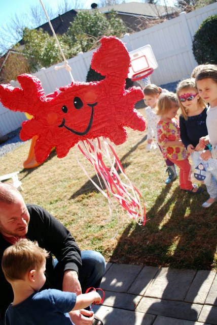 Then we did the pull string pinata. TOTALLY AWESOME. I mean really, is it a good idea to hand bats to our 2-4 year olds and BLINDFOLD them and tell them to beat down a paper mache shape? No, no it is not. They were all so cute in a little line taking turn pulling the strings off… then Linc did the last few.