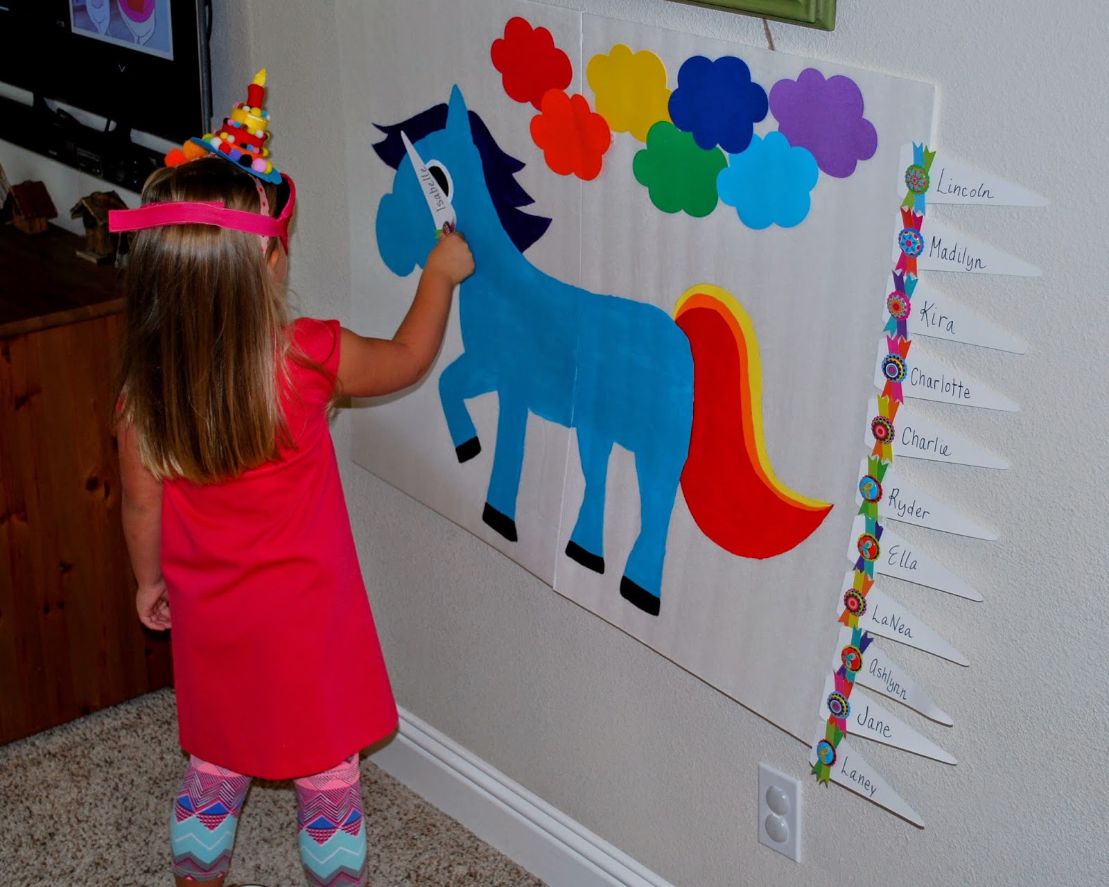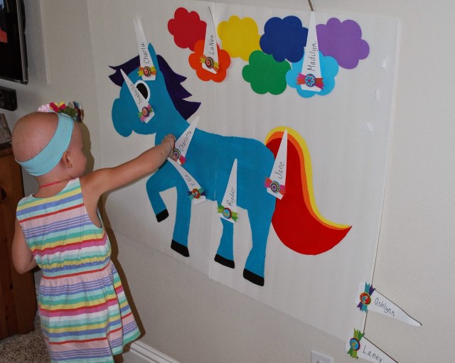 She picked out this design from a few we looked at on etsy because I literally can not operate any computer program newer than like microsoft word, the ’95 edition. I had them printed at vista print and they were great. I made this giant pin the horn on the unicorn game with some foam core and paint to match her invitation.