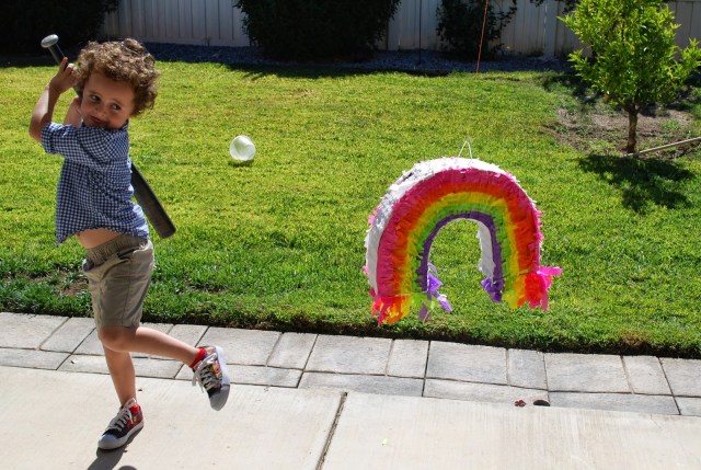We also had a pinata with a BAT. It sort of goes against my better judgment but I had a hard time finding a pull string pinata that went with our theme. Each kid got a turn with two hits then I finished it because it was 100 degrees outside, I kid you not. (Funny story, I called my dad and asked him to bring a bat over because we don’t even own one… he showed up at the door with this totally gruesome halloween bat decoration. He’s all “here’s your bat!” and laughed for like an hour. Dad you are the best.)