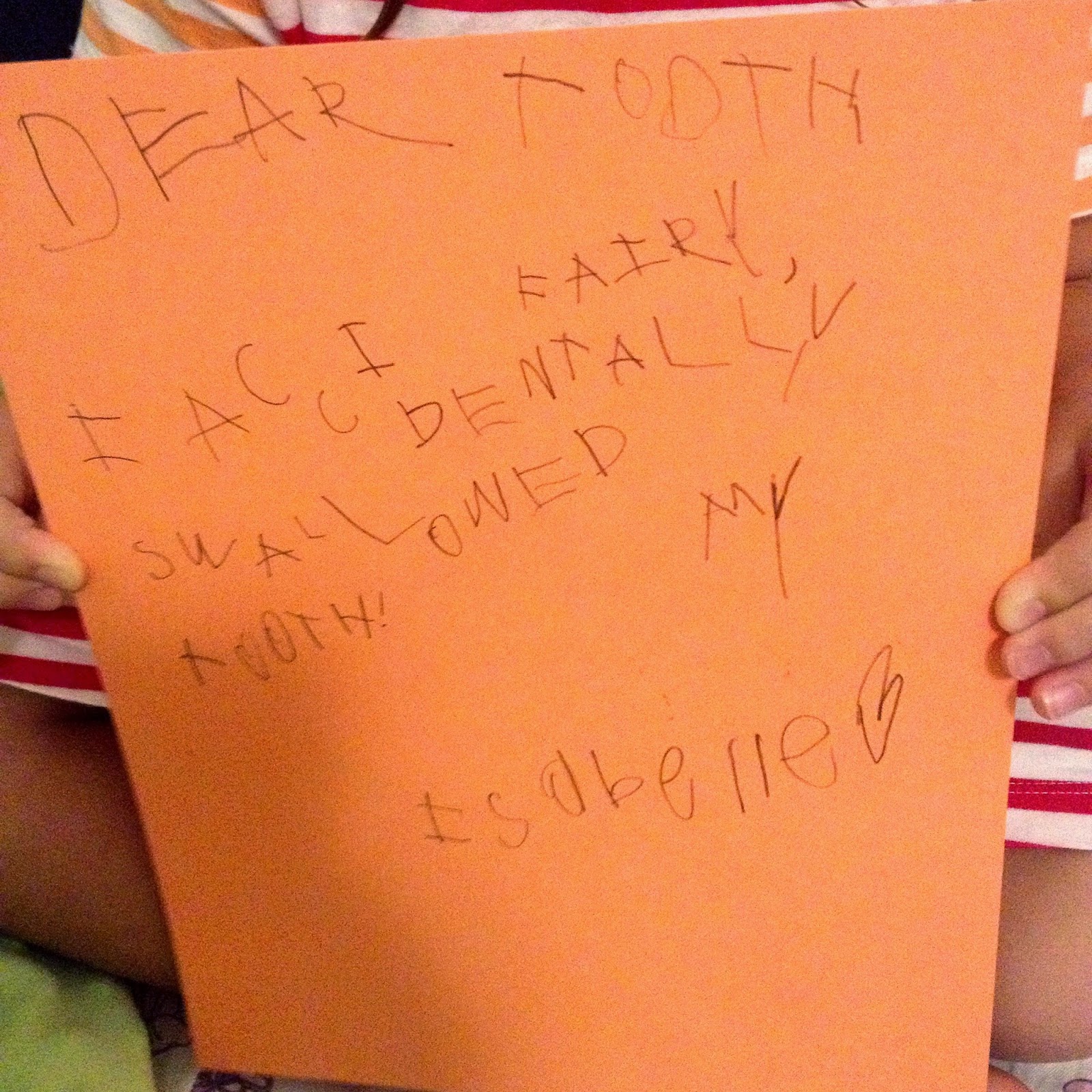 She was very concerned the tooth fairy wouldn’t visit her since she didn’t have her actual tooth so we wrote her a little note. I love her little letters and the lopsided heart at the end.