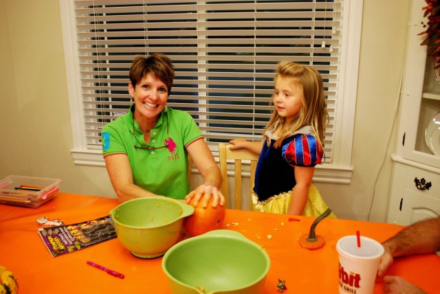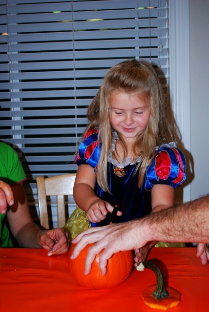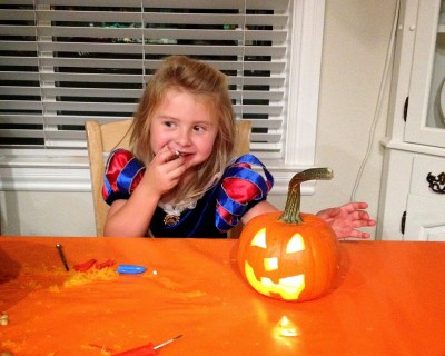Thursday we carved pumpkins. I say “we” and “pumpkins” lightly because the stores were sold out of carvable pumpkins. I’ve had tons of small and medium pumpkins on my porch for weeks but neglected to pick up our carving ones until they were literally all gone. Great job, mom.