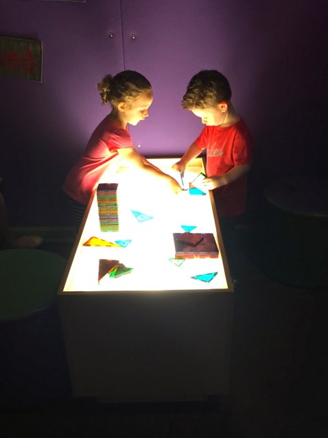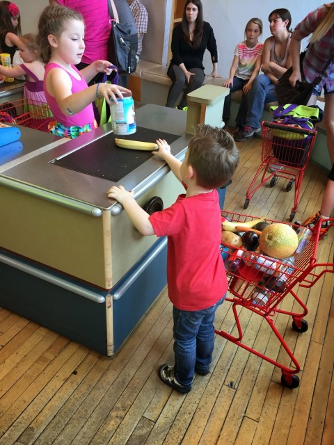 | the grocery store room. adorable. This cute little girl scanned all of Lincoln’s things and bagged them.