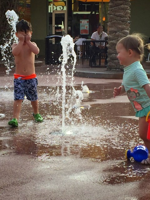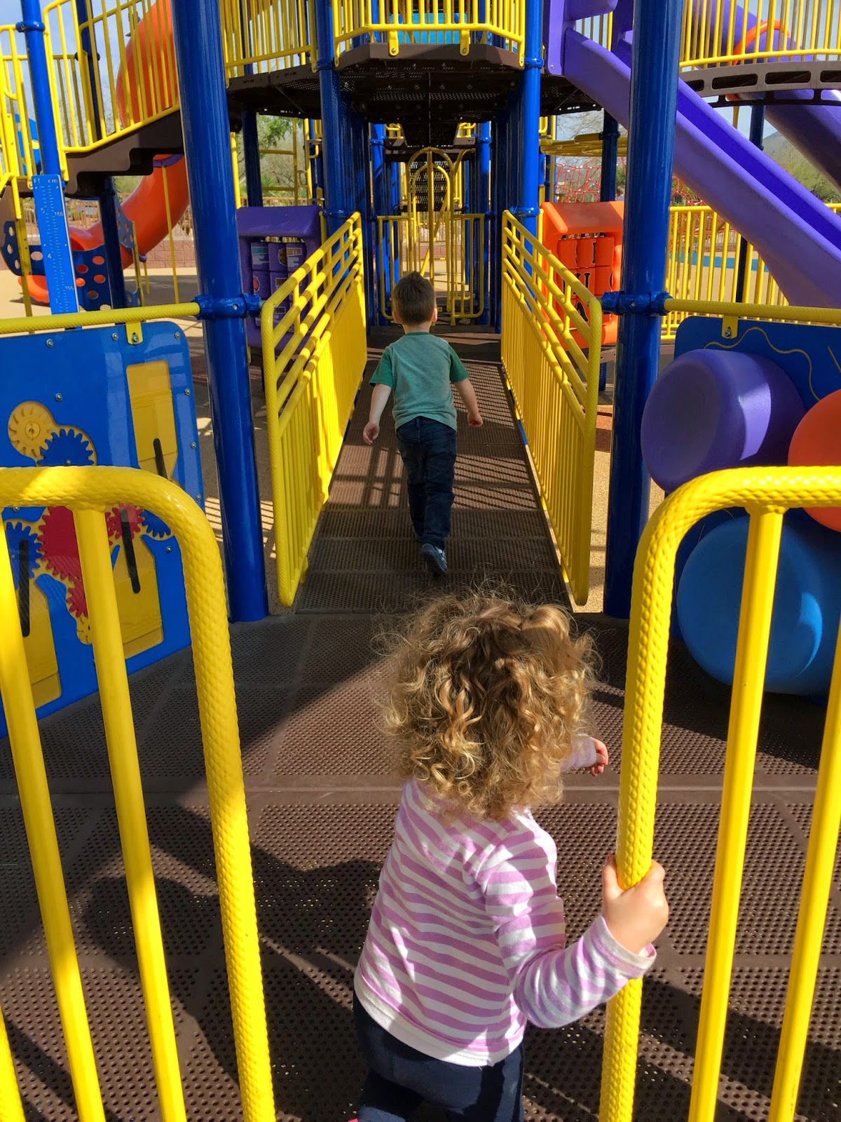 We got there and immediately went home to PLAY. Margo is 2 1/2 (don’t let her height fool you) and she and Lincoln were best little buddies. They understood each other really well which was adorable because sometimes grown ups can’t understand Linc. You know, toddler language. Every morning we got up and got ready, packed a lunch and left on an adventure. Phoenix has SO many fun things to do- we thought we could try to do a couple and we ended up doing everything we wanted and more. This is a giant park north of their area. I mean, giant. Three stories of climbing and huge slides and a sand pit and a toddler section and a splash pad in the summer and everything you could ever want. Linc and Margo just followed each other around.