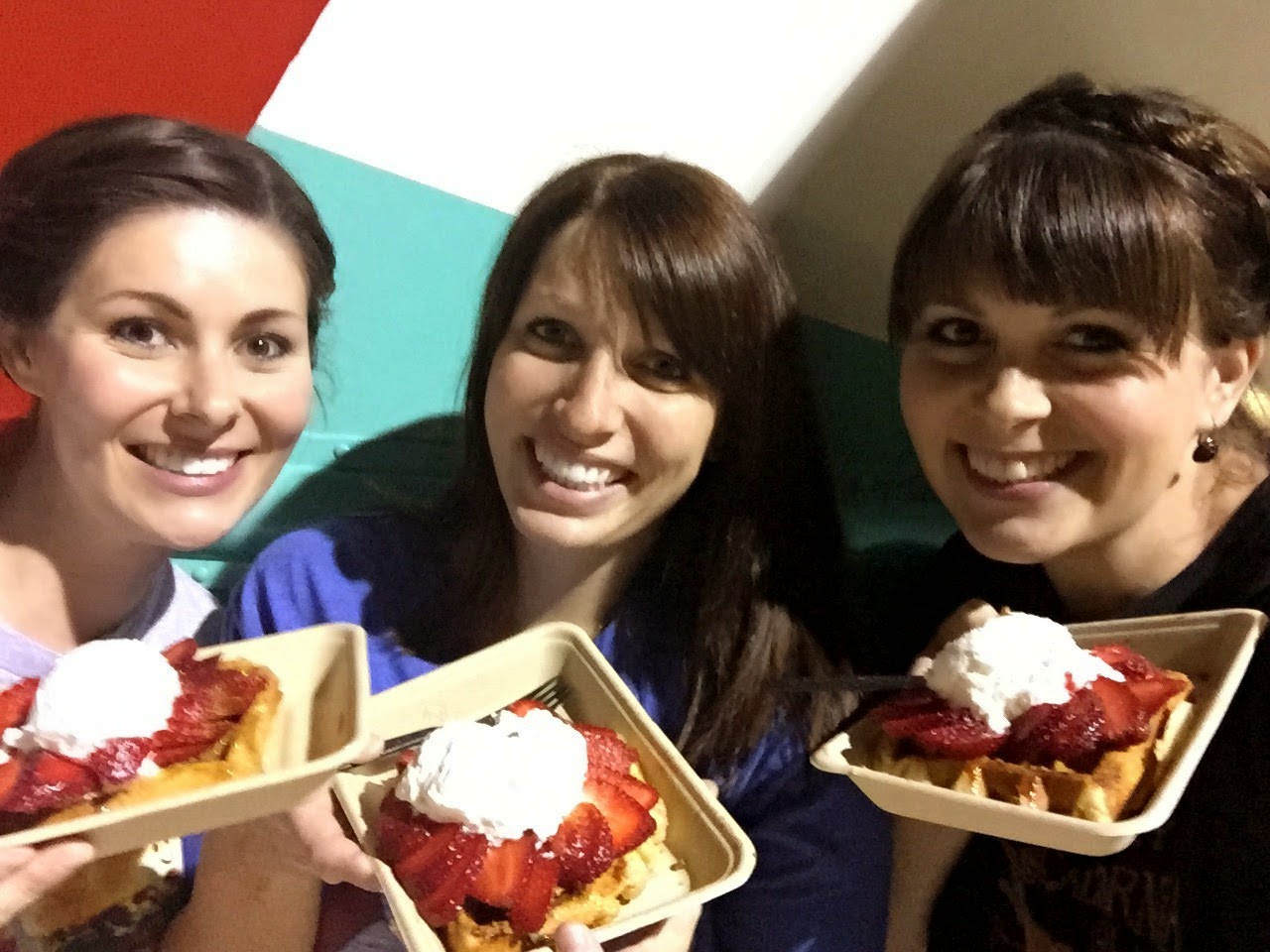 After the kitchen was clean and the babies were asleep (we skipped naps so it was like 7 pm PASS OUT. goodnight children.) we ran to waffle love. My utah friends will know what I am talking about- it’s a food truck that serves gourmet Belgian waffles with all kinds of fancy toppings. Morgan literally hopped the fence to make sure they were still open. I 100% thought she was going to fall and die but she made it in good shape. The original plan was to share mine. I had one bite and I was like dude, order your own.