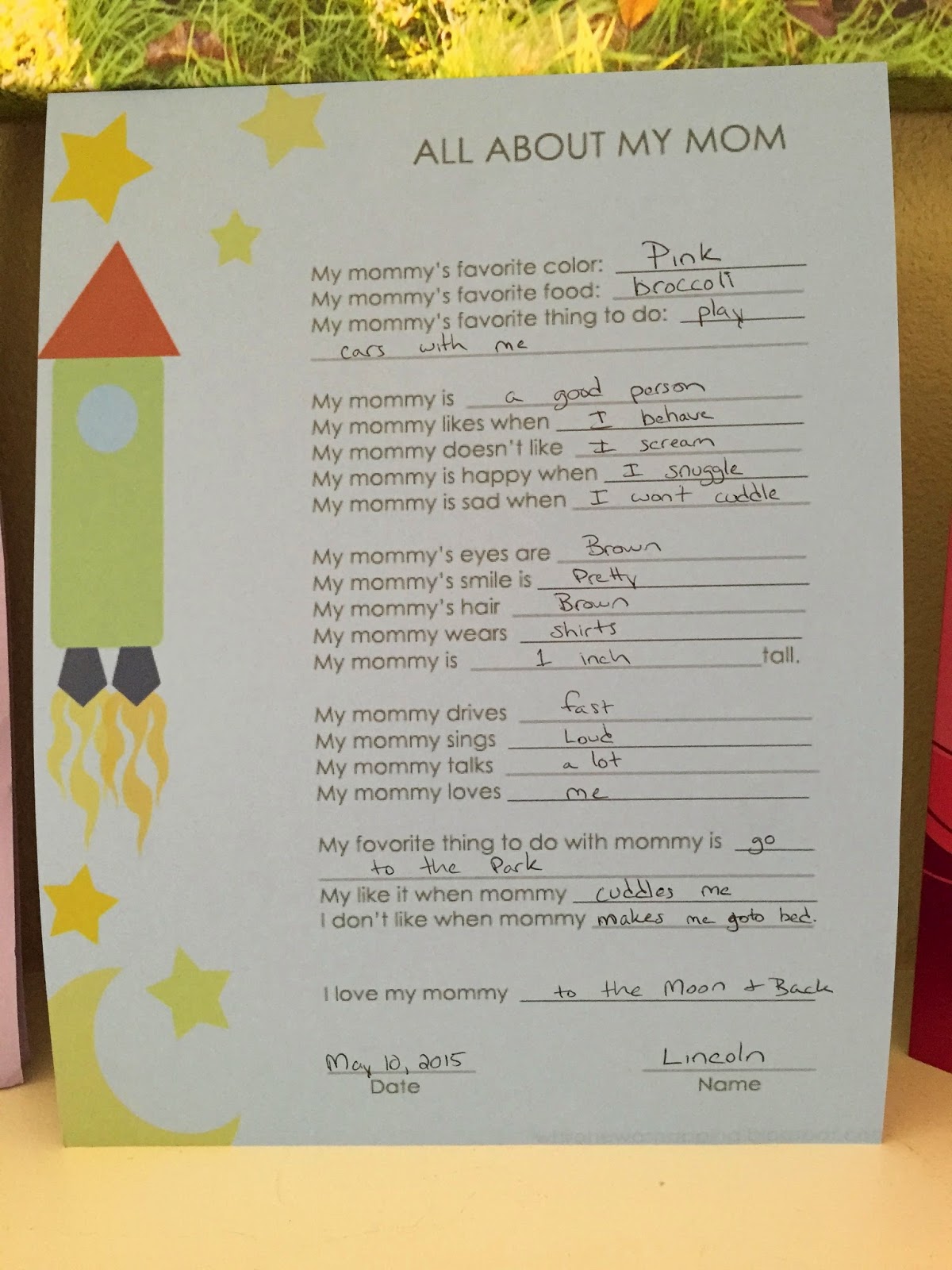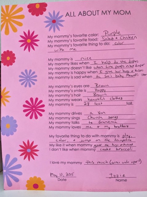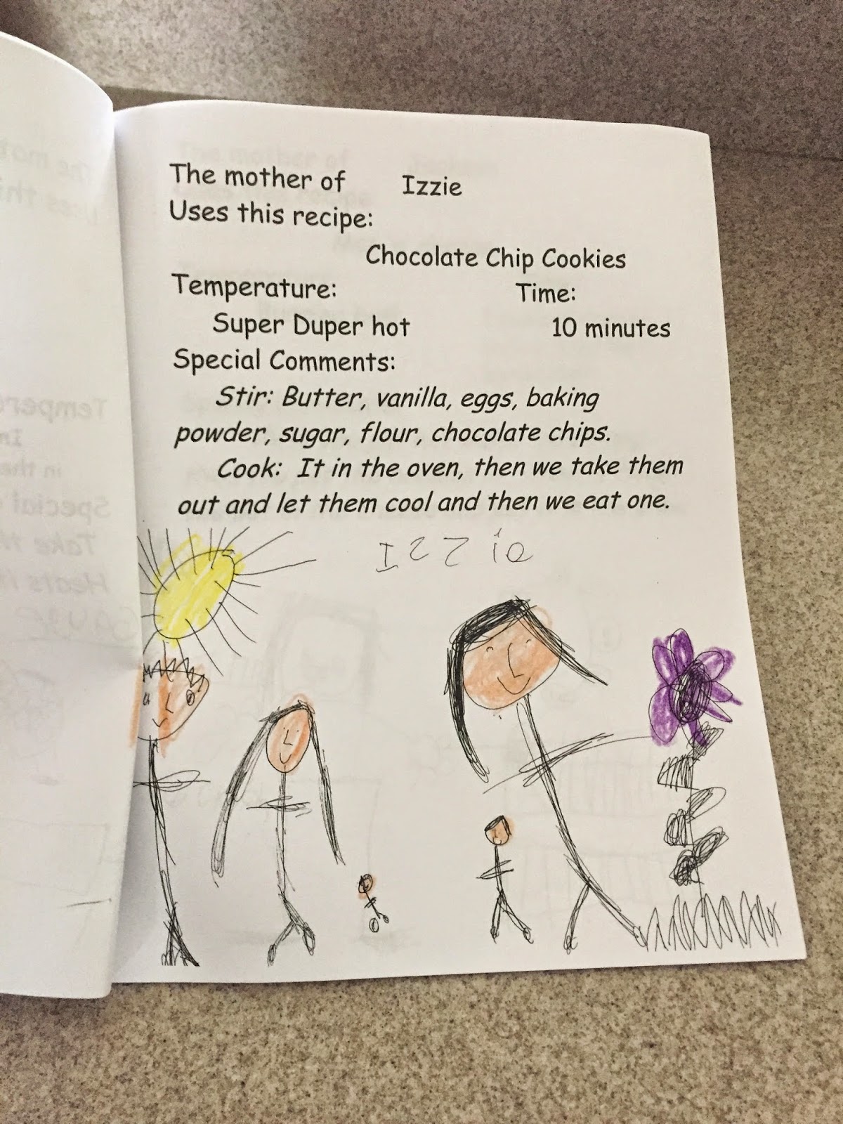 Isabelle’s class made a special recipe book for all the moms. It was hilarious- the kids wrote down their favorite recipe and how their moms make them. Of course my kid’s favorite meal is cookies.. though she did remember quite a few ingredients!