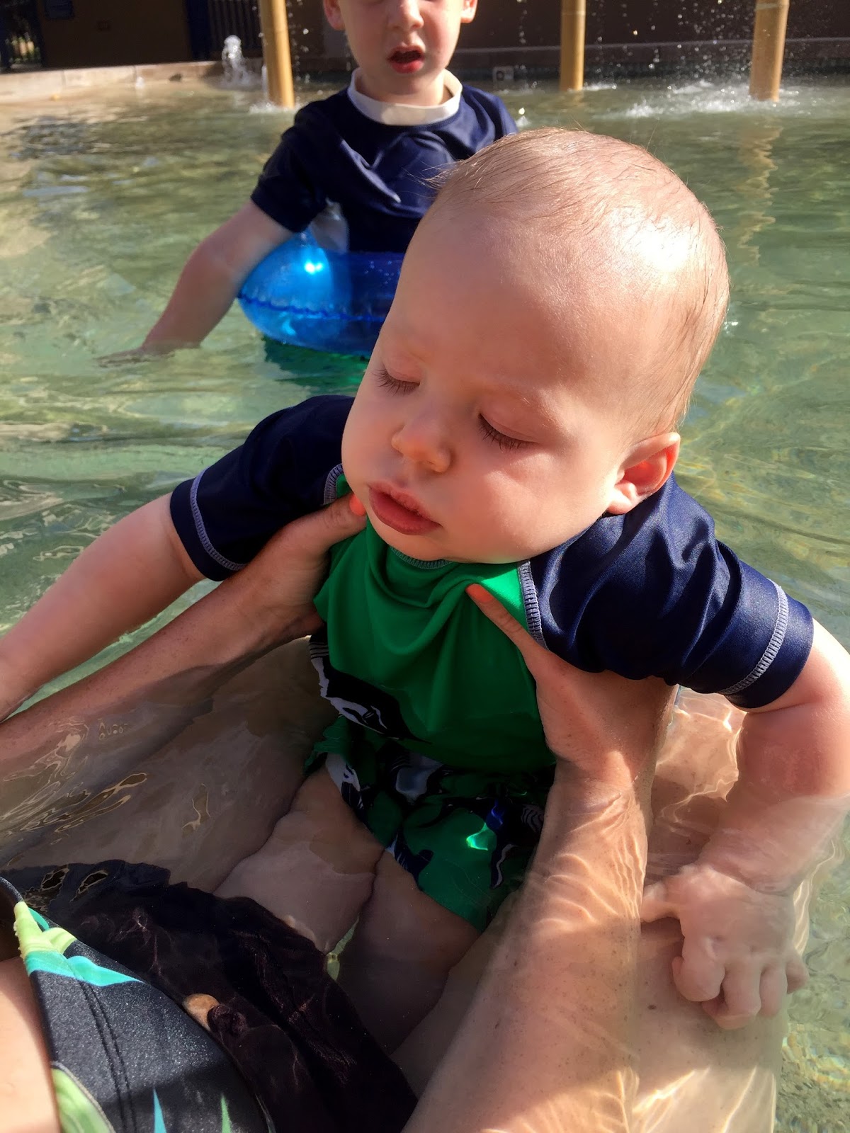 Archer is the most mellow baby, he just goes with the flow and hardly makes a fuss. The kid’s pool has a great little play area and a few bubblers to splash in. Apparently it wore him out because about 20 minutes later he was asleep sitting up in the pool.