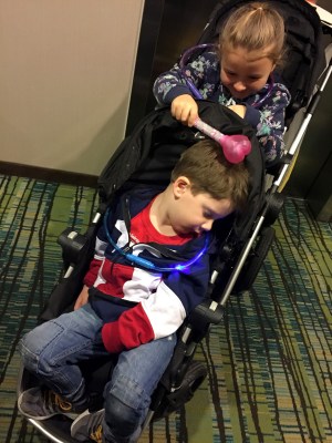 We were pretty wiped out by the time the park closed at 8. Linc fell asleep in the stroller I think every night. When Isabelle is exhausted she gets the giggles- she thought it was pretty funny to pretend to hit Lincoln on the head with her glow thing. This probably isn’t funny to anyone else but these are my kids so it’s hilarious.