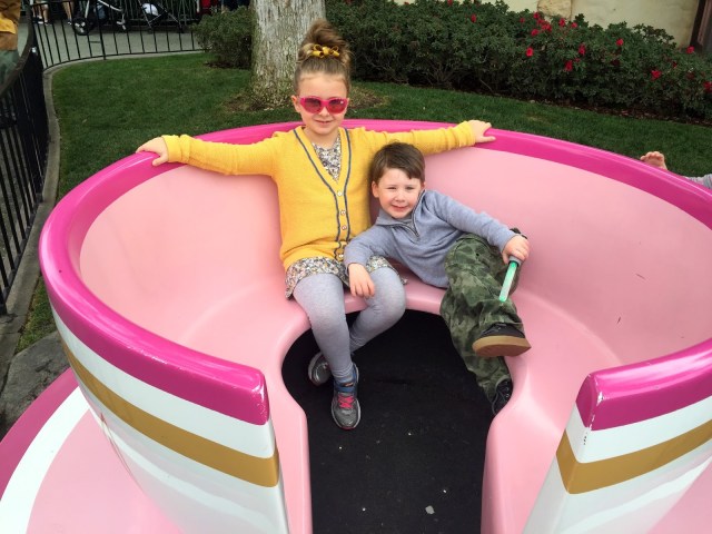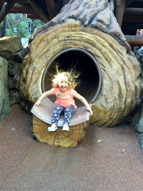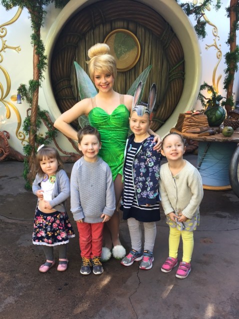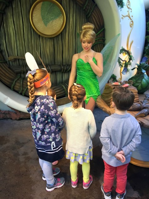 So initially we were scheduled to drive home on Friday. Thursday came and we were all really sad! We really hate to leave, especially when we are having SO much fun, the weather was perfect, the park wasn’t too busy… and Grandpa came through with the best text ever: “Hotel is booked. Have fun. I love to be Santa!” He is THE BEST. So we got a lucky hot dog day. (Always pack an extra outfit or two) Our last day was spent mostly at Disney… We don’t always get to visit Tink in Pixie Hollow because the line is LONG and it moves SLOW but we went there almost immediately and only waited a few minutes. This particular Tink was extra good- the girls had really good questions about pixie dust and Terrence and the fireworks and she had smart answers for them. It must be exhausting to be in character like that for long periods of time.