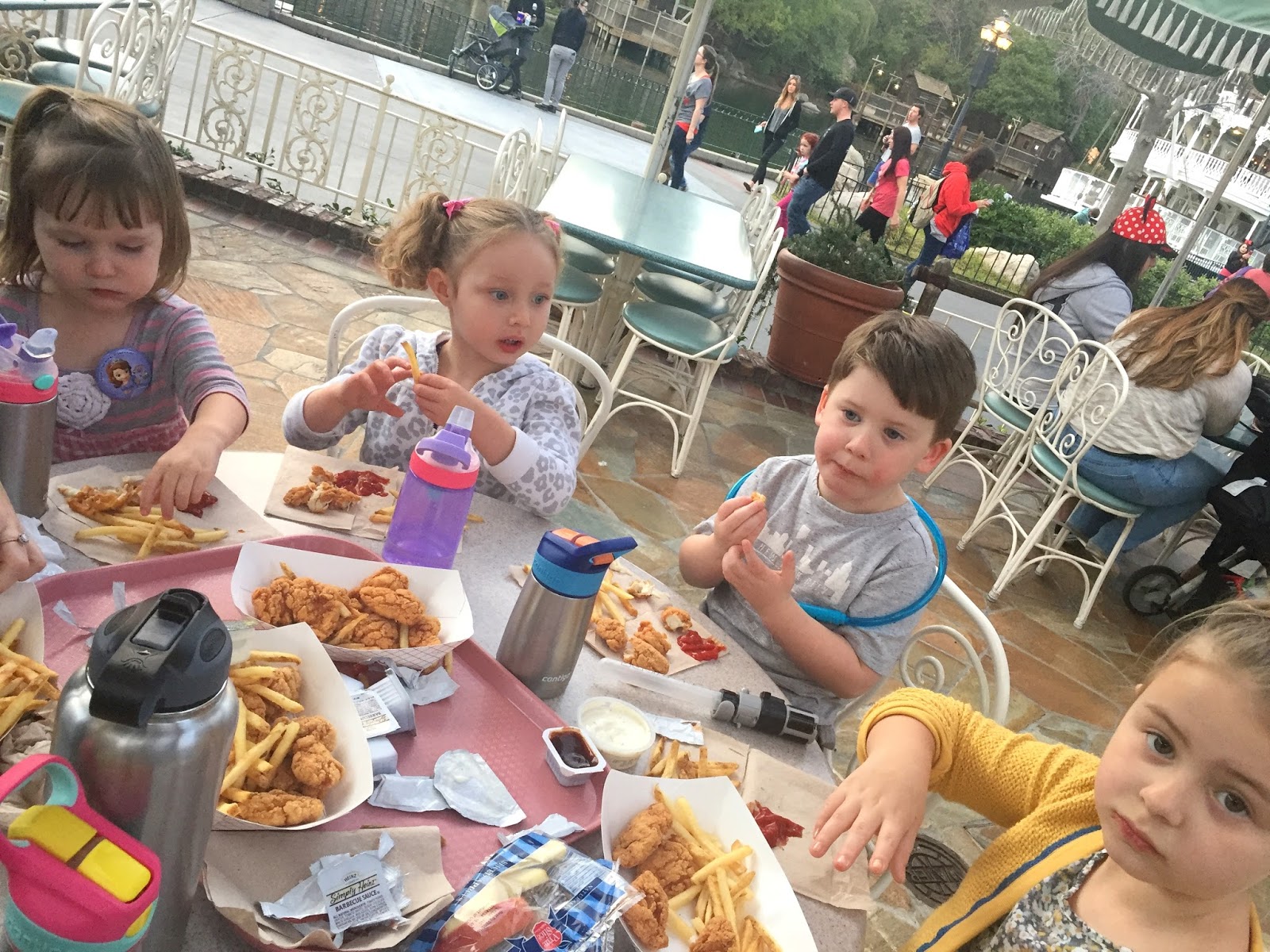 Probably four of the days we brought in our own lunch. Morgan packed a ton of sliced turkey and cheese, we made sandwiches and ate it with pretzels too. Mom brought homemade bread and made PB and J’s too- never a shortage of food. Applesauce pouches, fruit cups, easy things to bring. This is what it looked like when we ate lunch with all the kids. NUGGETS FOR DAYS. TIP: Bring your own water bottle to fill up. We are partial to the metal contigos for the kids and the hydro flask for me- stuff stays cold so much longer. Almost anywhere throughout the park will give free water and ice- they have fill up stations all over too. We just bought adult meals and split them between the kids, saves $$ in the long run.
