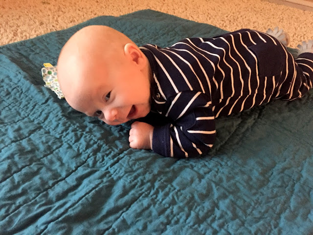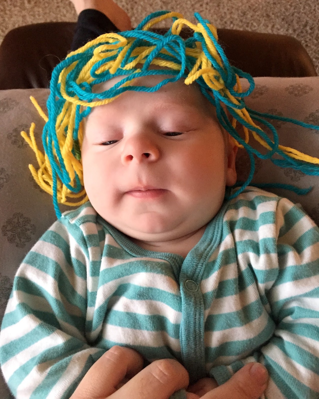 | This just made me laugh- Linc found a bunch of yarn and brought it over to make Thatcher some hair. |