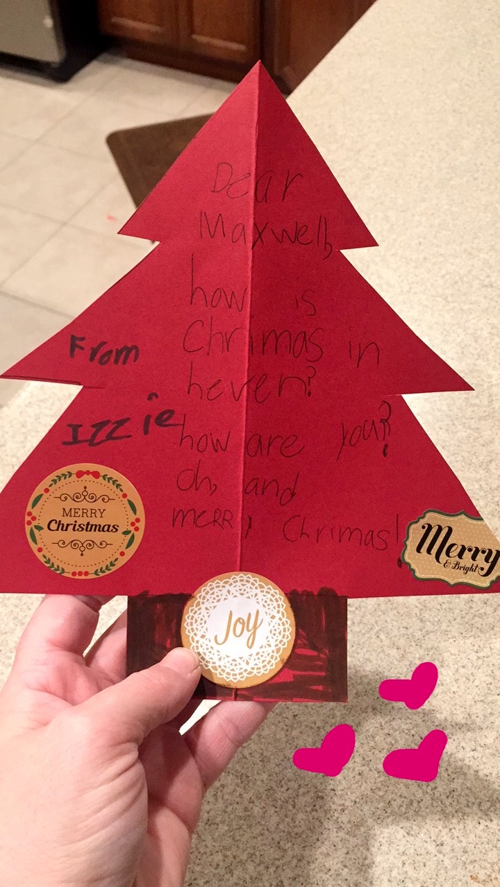 We spent one Saturday morning making Christmas cards for Max. Isabelle wrote Dear Maxwell, How is Christmas in heaven? How are you? Oh, and Merry Christmas! I wish I took a picture of the back, it was the cutest little picture. I love her. Linc wrote, “Dear Max what is heaven like? Love you. love, Lincoln. I was feeling very overwhelmed with the absence of Max this year, and doing something to remember him always makes me feel better. We laminated our cards and spent some time at Max’s Park cleaning his stone and bench off.