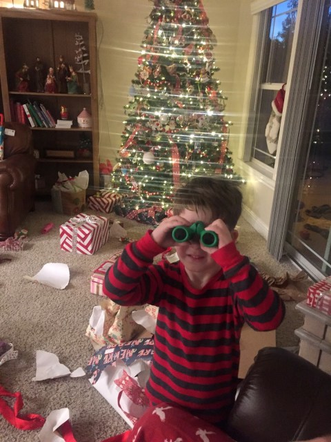 | very very excited about his binoculars. |