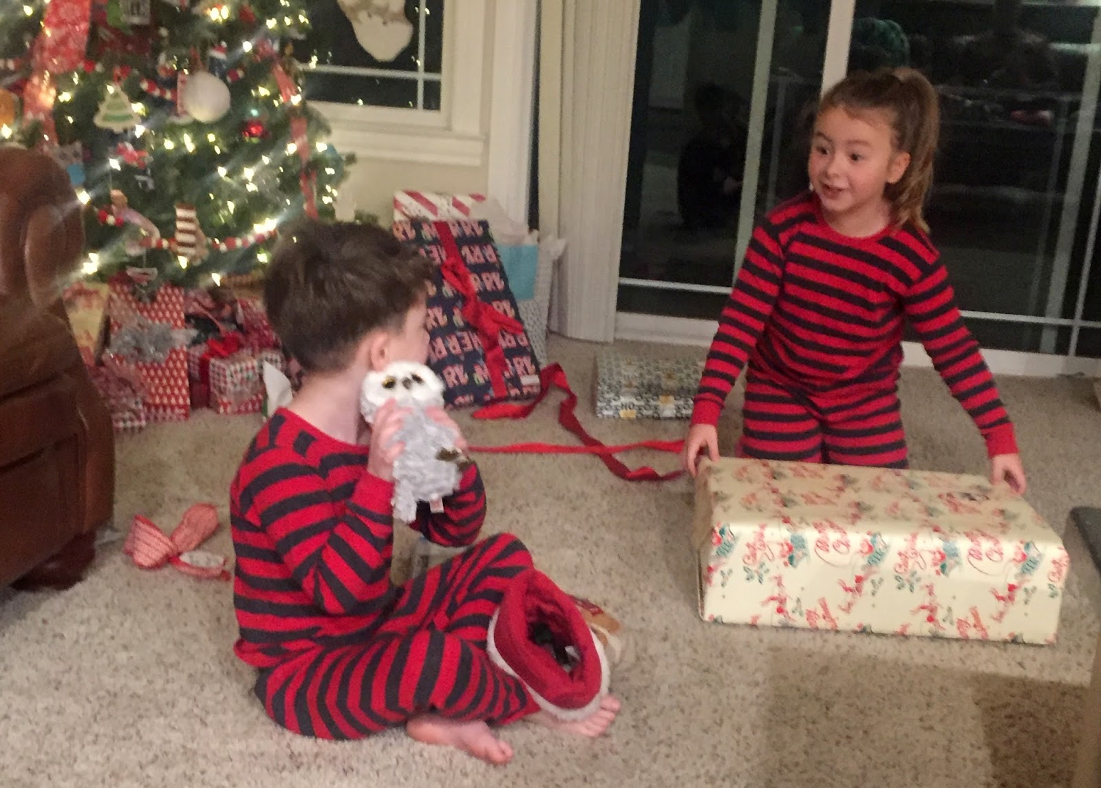 6:00 am came quickly and the kids were up. My parents came over at 6:30 to watch the opening of presents and the kids sort of patiently waited for them to arrive. I thought it was so cute that as soon as they were allowed to come out and open presents- they found the ones they had purchased for each other so they could open them first. Cute.