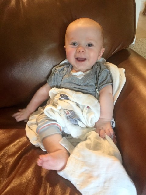 Wearing size 3 diapers, 6-9 month clothes, somewhere around 15 pounds- he has these tiny little arms and a few delicious rolls on his thighs. He is starting to get on more of a schedule- taking a morning nap and an afternoon nap and sometimes a bonus one before bed. Night time sleeping…. varies but usually he wakes up 1-2 times to nurse and then goes back to sleep. He likes to fall asleep with a little softie blankie by his face. He does wake up early though, usually between 6 and 6:30 and Jazz is incredibly helpful to take that early shift so I can get a few more minutes of sleep. I love sleep.