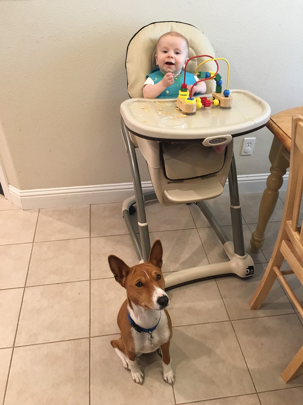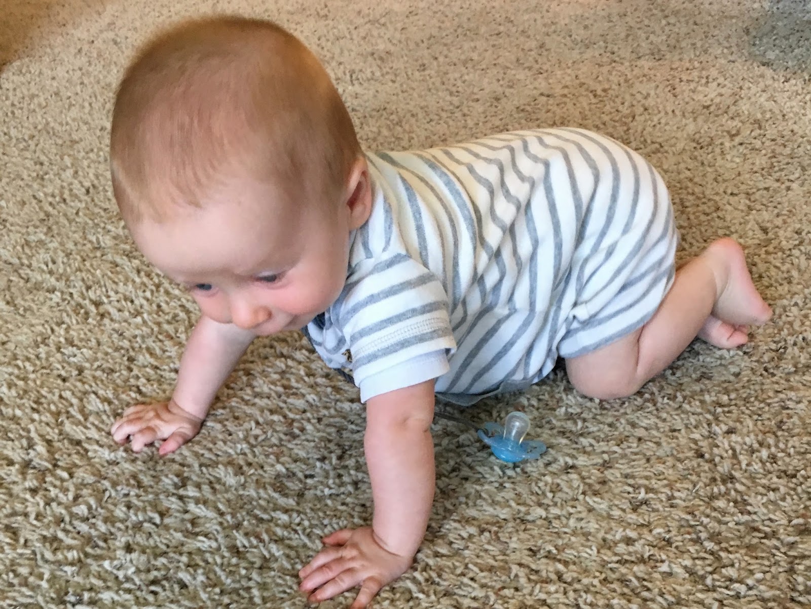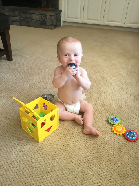 Happy, happy little baby. smiles at anything. Smiles at sounds. Smiles at the dog. Loves Lincoln and Izzie. Laughs the most for the kids and for funny noises like Velcro coming undone and this ridiculous hamburger song Lincoln sings. And he is full on crawling! Just last week, so technically 9 1/2 months. Obsessed with trying to find all the dog toys, crate, food, anything. He pulled himself up to a stand yesterday and naturally I pushed him down and said YOU QUIT THAT.