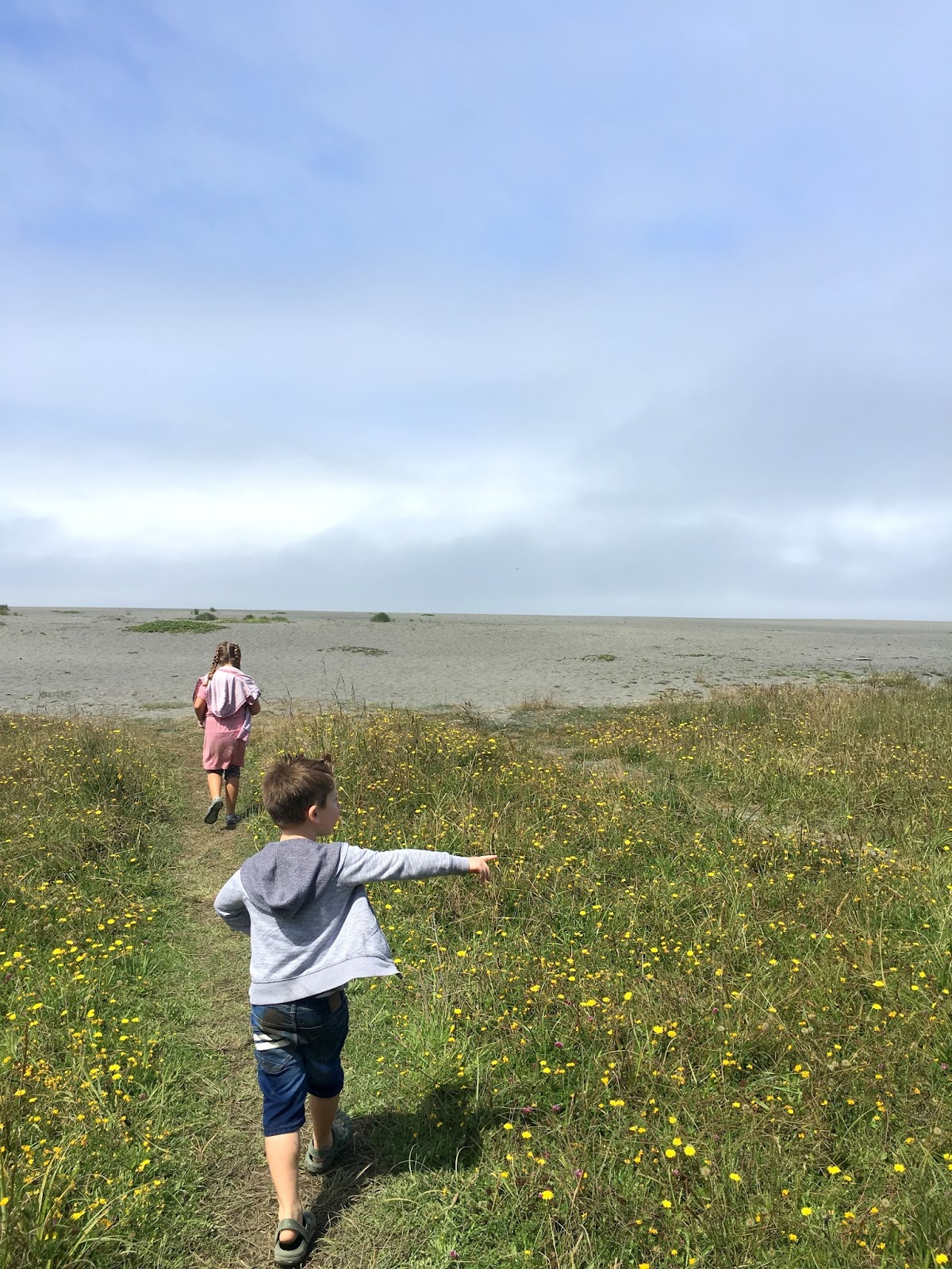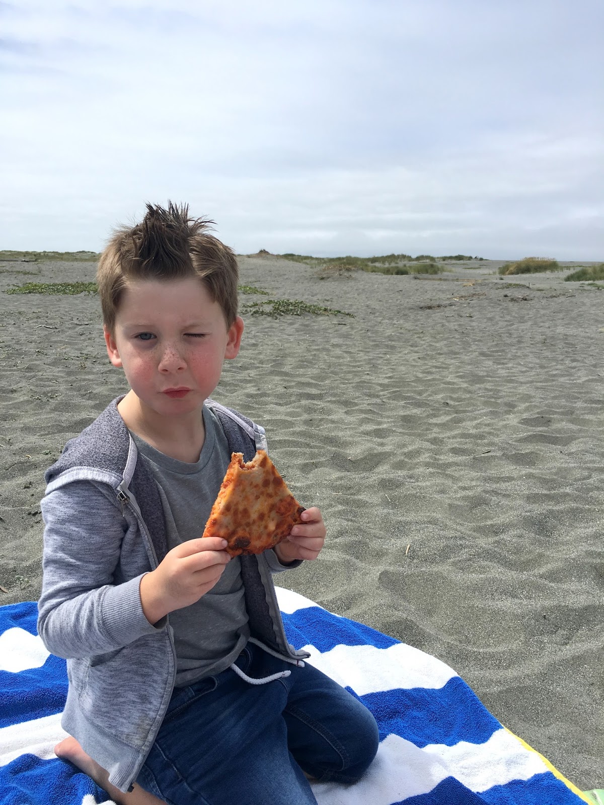 So we spent a good portion of our morning exploring that trail- it was an easy little walk but we were all super hungry by the time we got back to the car. We grabbed our cold pizza and our sand stuff and hiked from the parking lot over to the beach. Sand for miles, no people, the perfect temperature wind, waves in the distance, pizza in my hand, my kids on towels next to me. We sat on top of a dune and ate our lunch… Linc brought his big airplane to play with, Izzie had some sand toys.