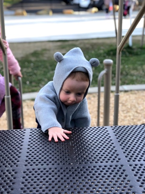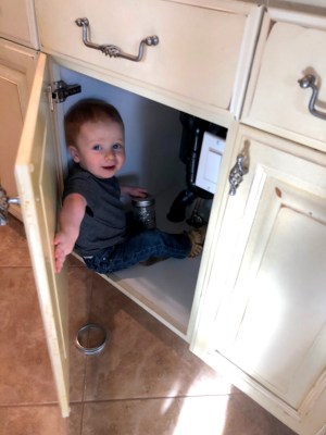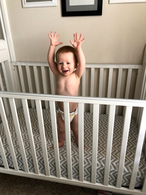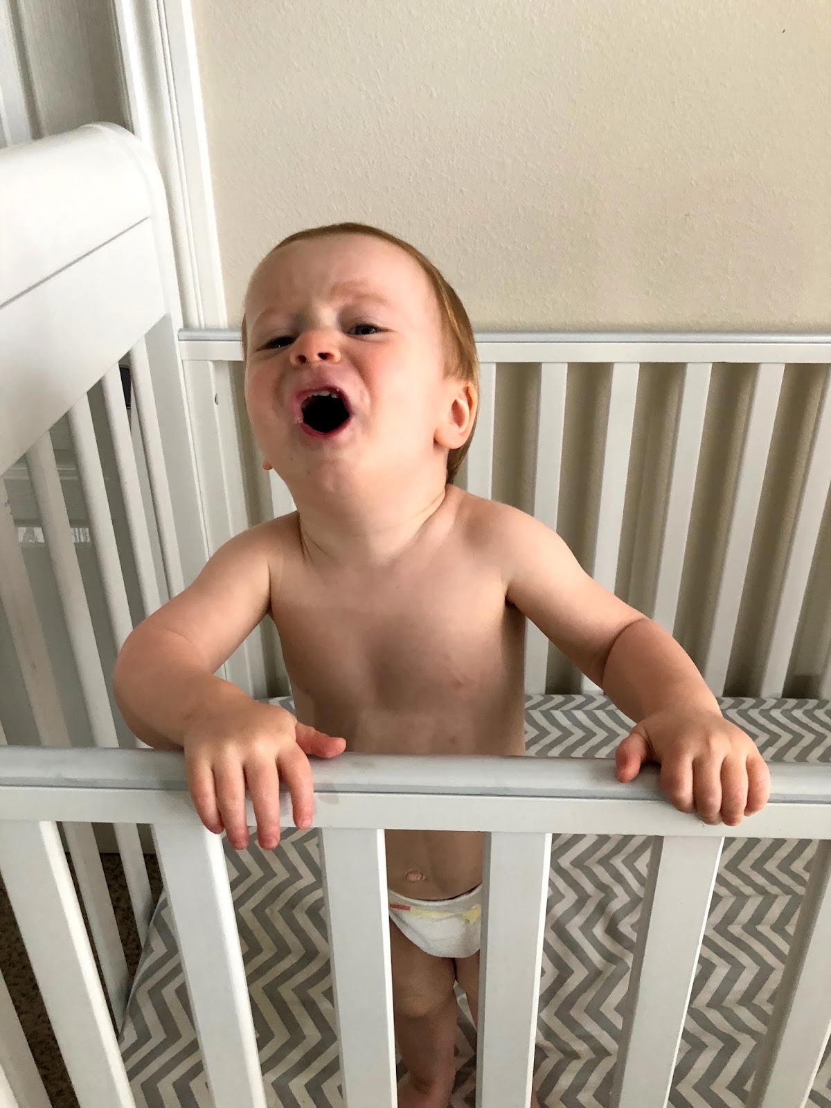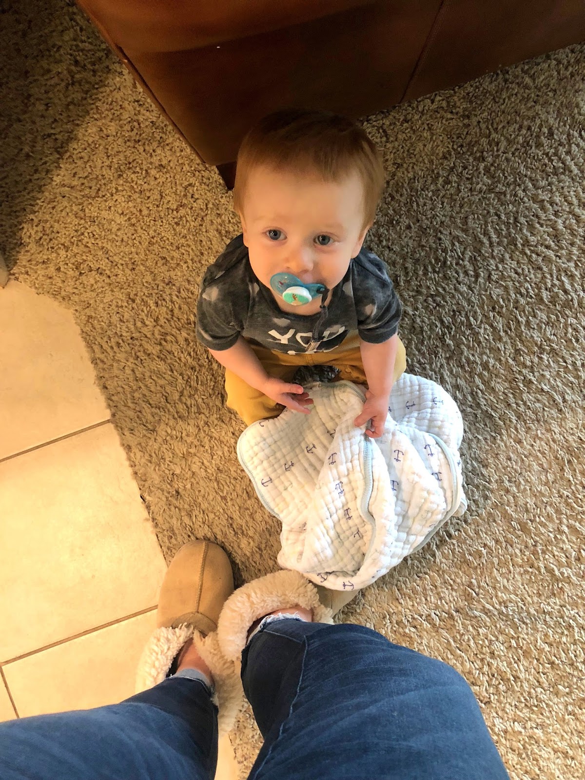 He is pretty good with his sleep schedule. He will go several days of sleeping through the night, and then several days of not sleeping through the night. I swear he is just hungry- he is constantly moving when he is awake, can’t be bothered to sit much, and then his little tummy is growling at 2 am! My other kids had a big sippy of whole milk before bed but I can’t get Thatcher to drink very much. He does take solid naps, and I appreciate that greatly. He falls asleep a lot in the car on our way home from somewhere, and I can lift his sleepy little body into my arms and carry him to his crib- on Sundays I can even change his clothes and he stays asleep! He loves his sleep sack- he fiddles with the tag on the bottom while he is getting cozy and drifting off. And his lovey- this little giraffe thing we call Stuffy. (Isabelle named him.) He is obsessed with it.