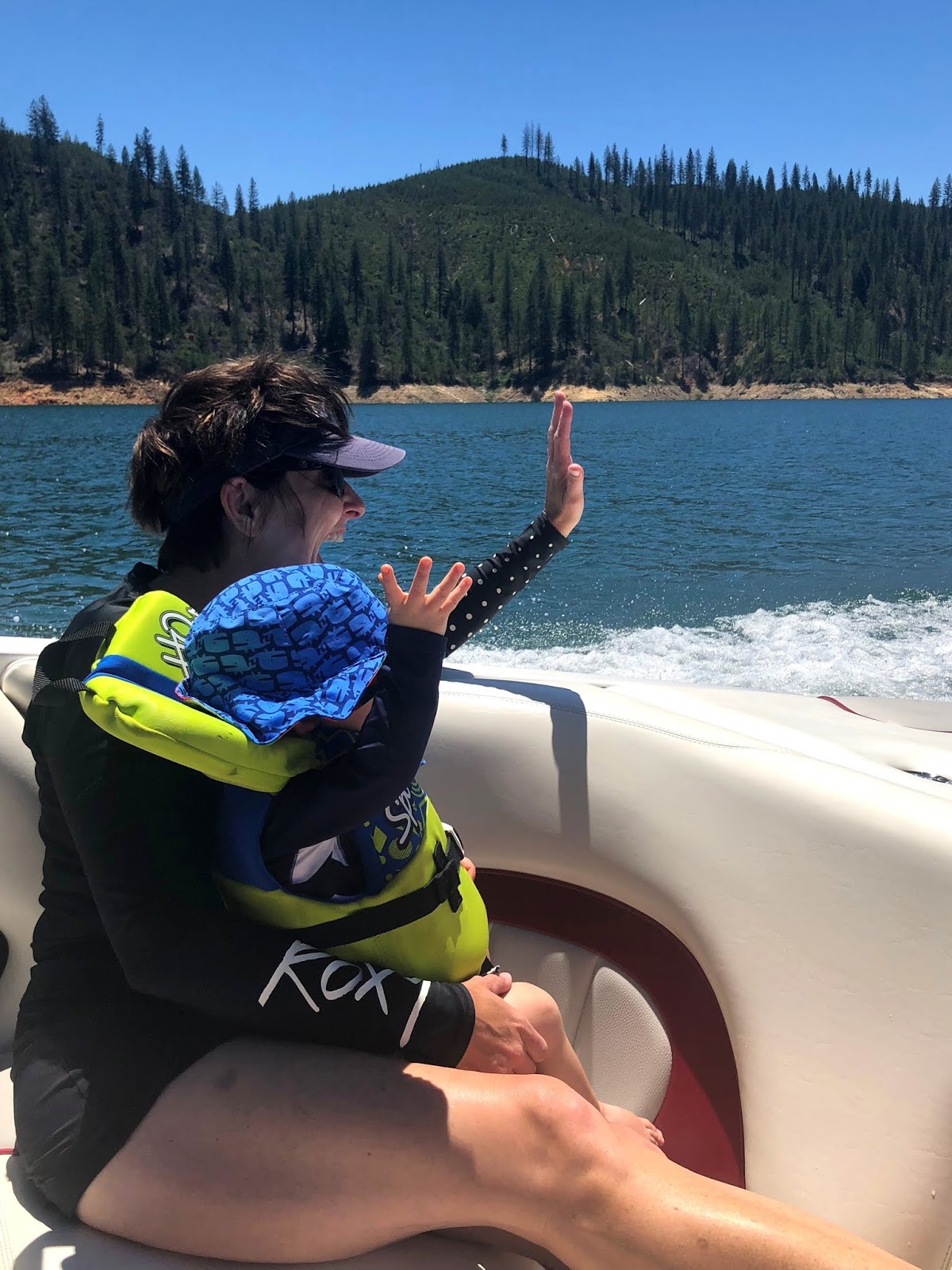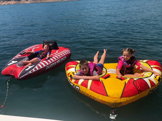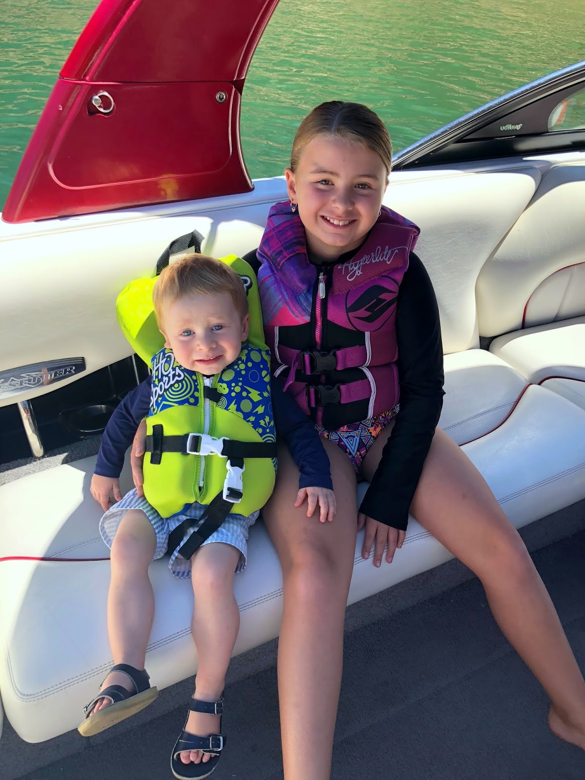 We endure blistering hot summers here for a few reasons- one of which is that there are several lakes conveniently located about twenty minutes from our front door. Throw a boat into the mix and we will probably never move away! The kids totally love being on the lake- tubing or even just swimmin around! I have to say, Thatcher in a tiny life jacket signing “more” when the boat stops is pretty freaking cute.