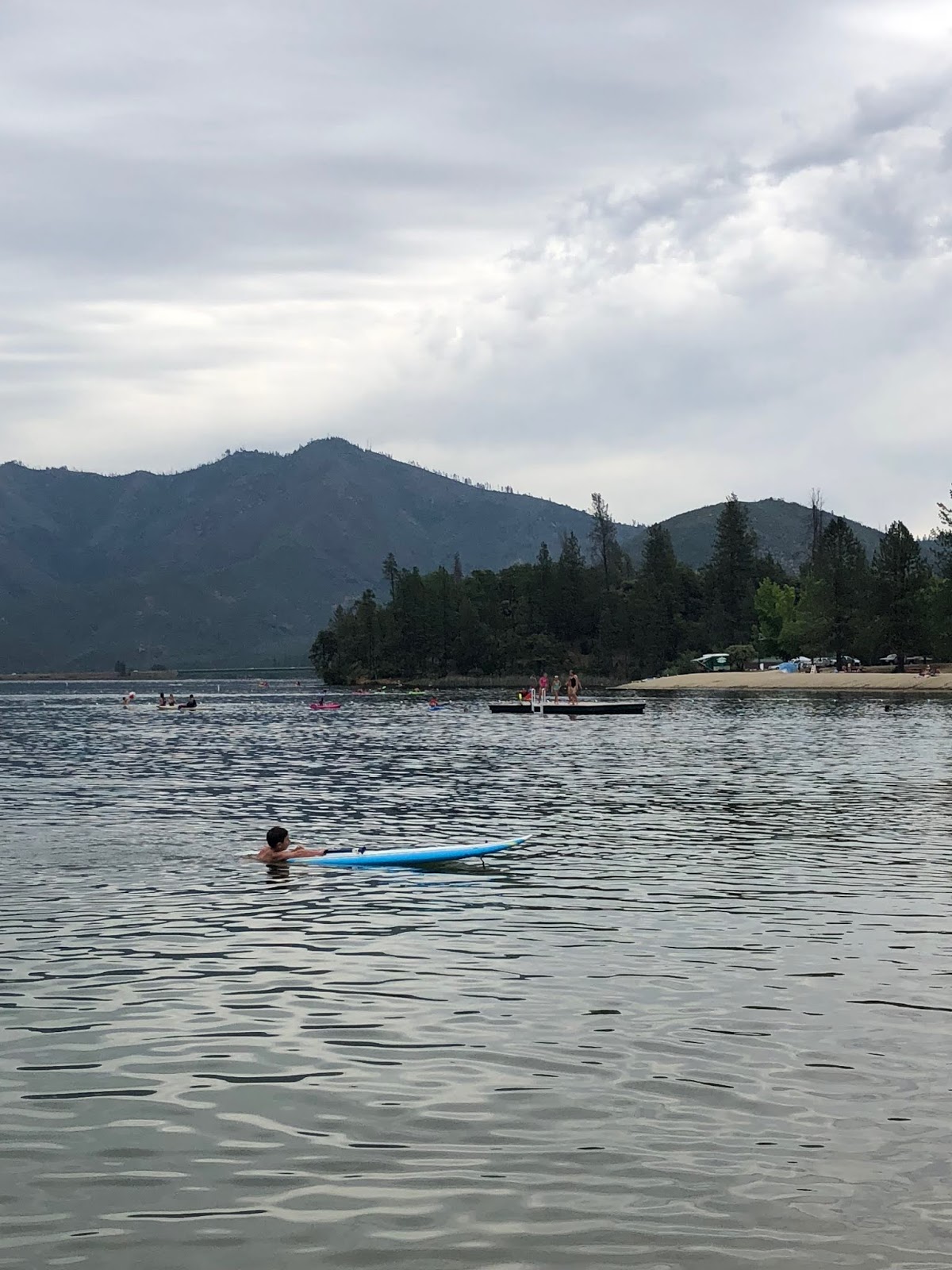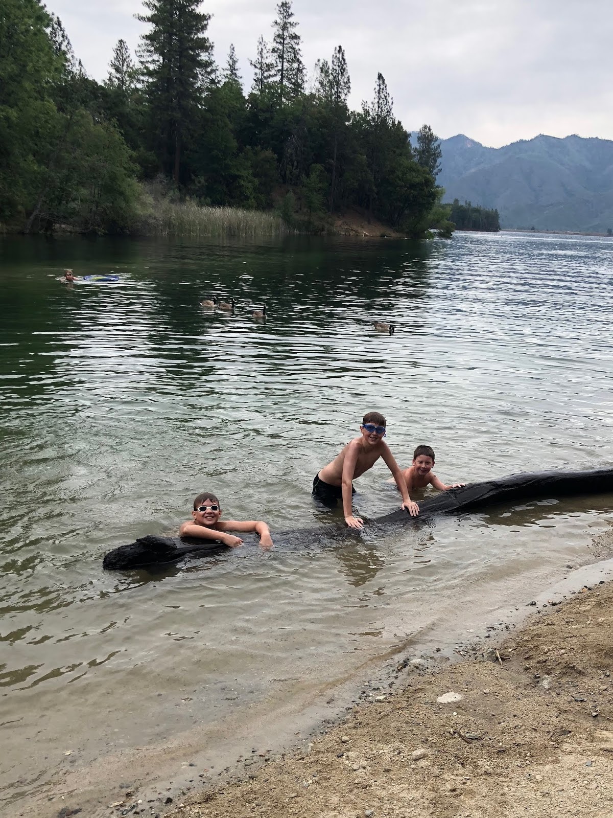 | Linc is swimming with the board, Izzie is up on that big platform |