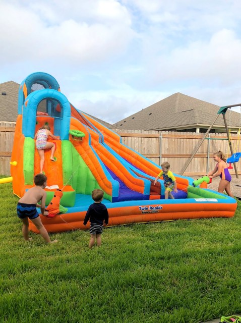 Is this the greatest thing you’ve ever seen? Poor Morgan was out there nailing in stakes and climbing to the top to attach the water hose… it was like a billion degrees out! The kids LOVED this so much, they are still talking about how fun it was.
