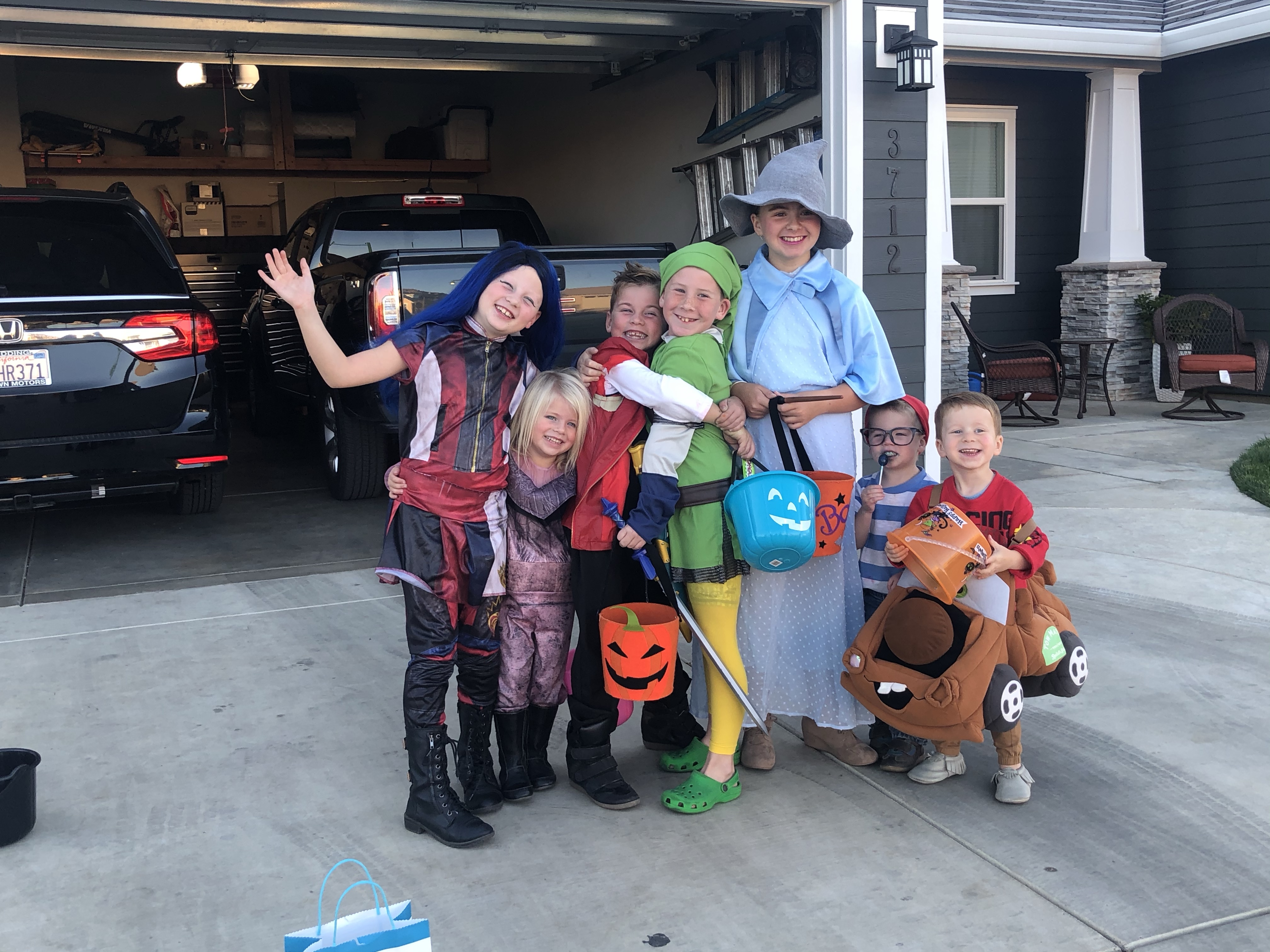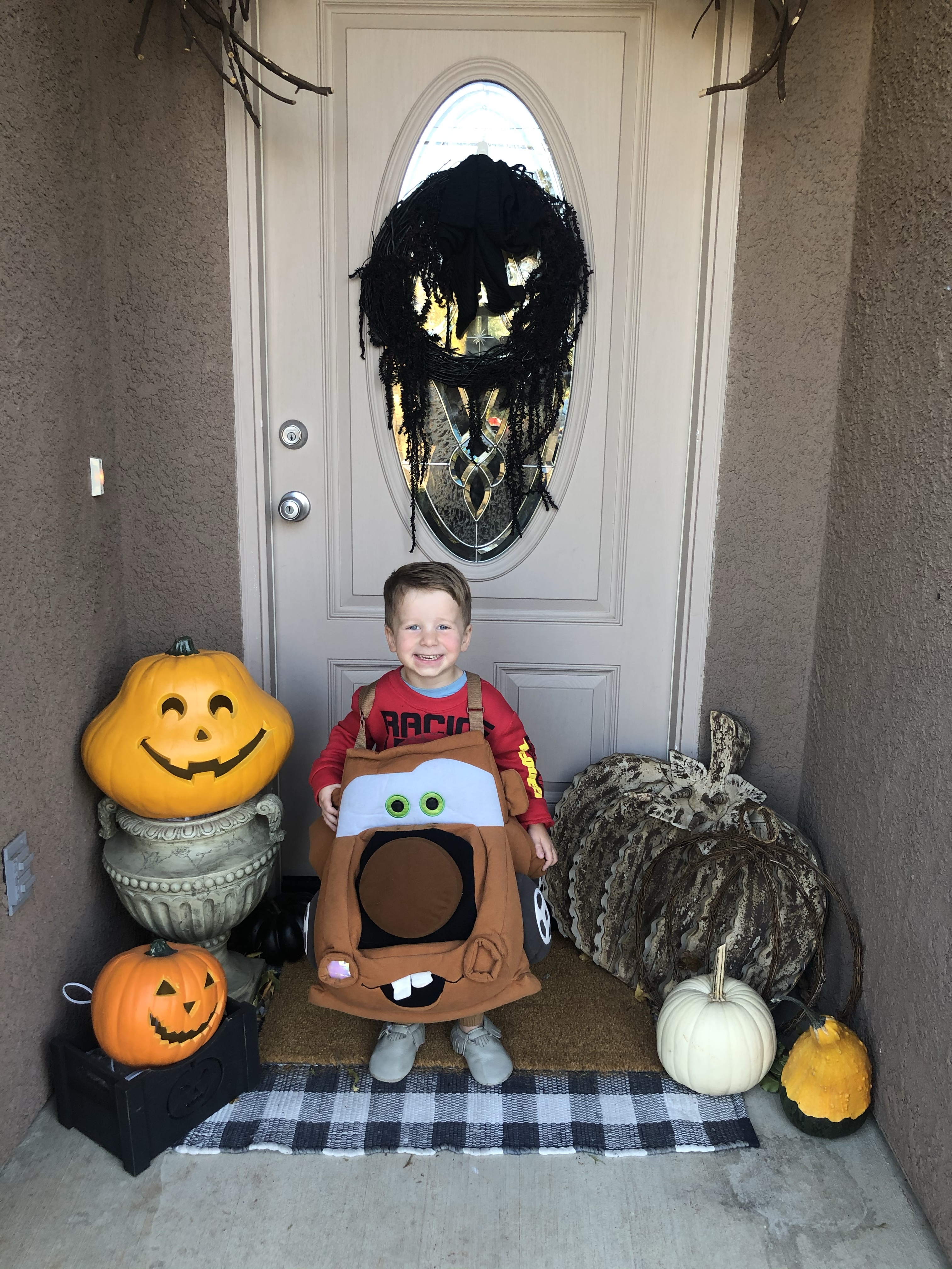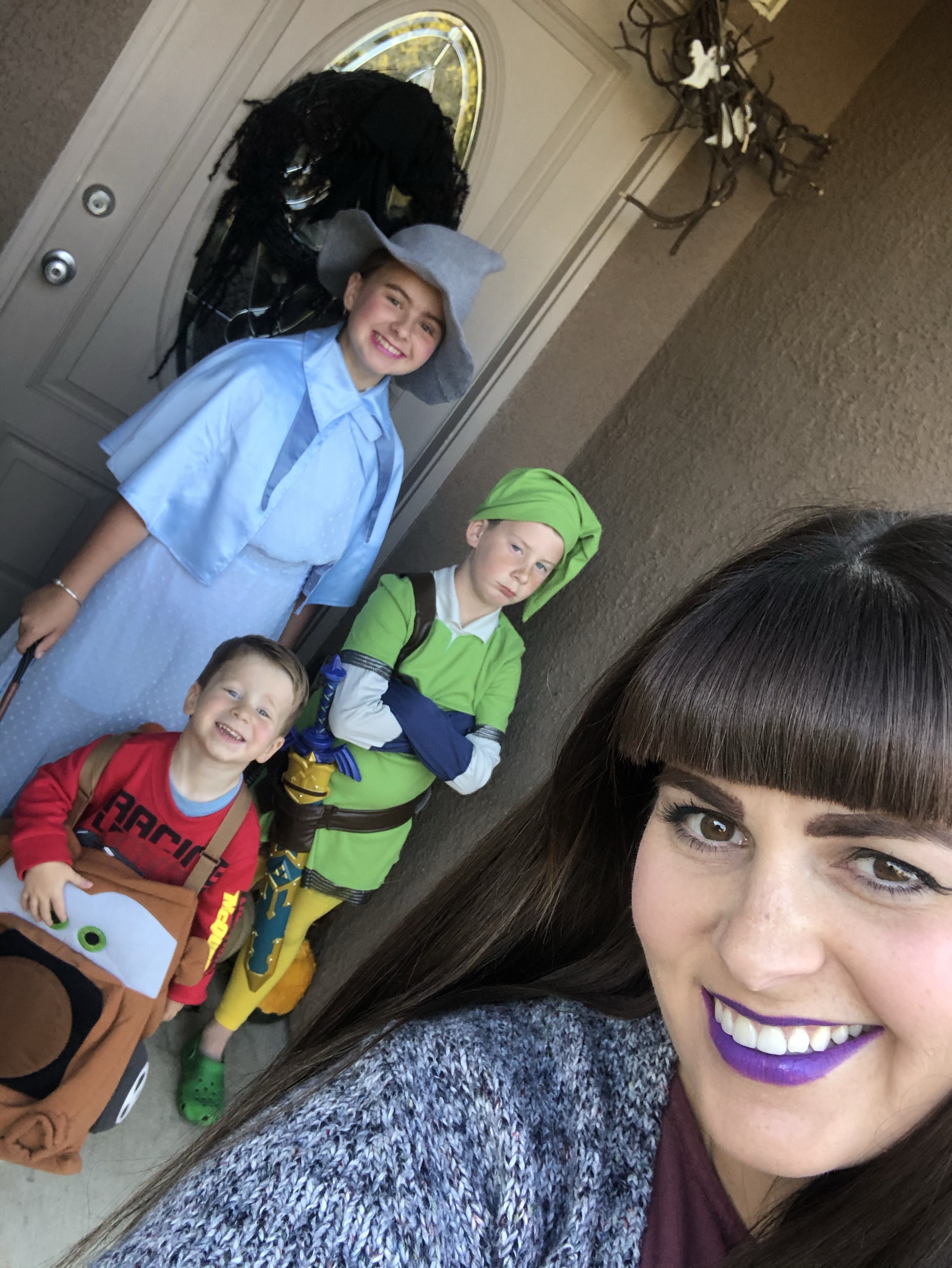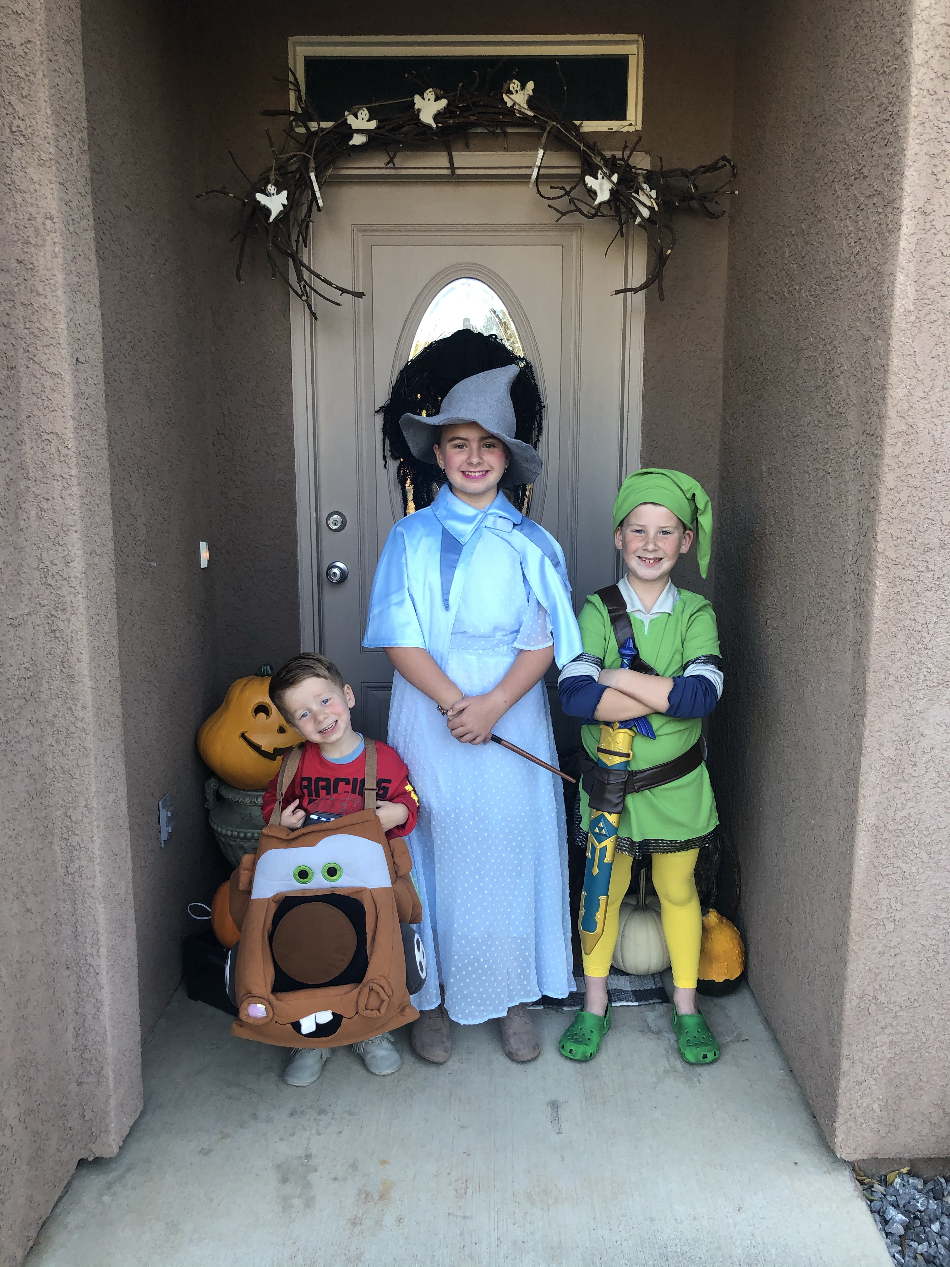 The kids chose their costumes: Linc was Link from Zelda (which I’m not sure he has ever played? Pretty sure he picked it because it was funny and also, yellow tights.) Izzie went as Fleur Delacour from Harry Potter, and Thatcher wore the Mater costume we’ve been hanging onto just in case. Grandma Cindy dressed up as the Michelle Pfeiffer from the new Malifacent movie. We had a big pizza/sloppy joe dinner at mom’s and then hit the neighborhood.