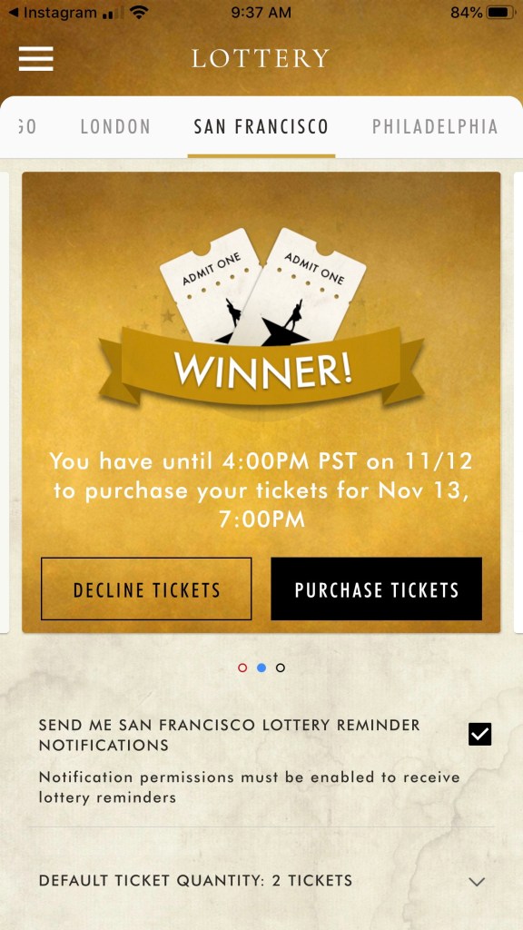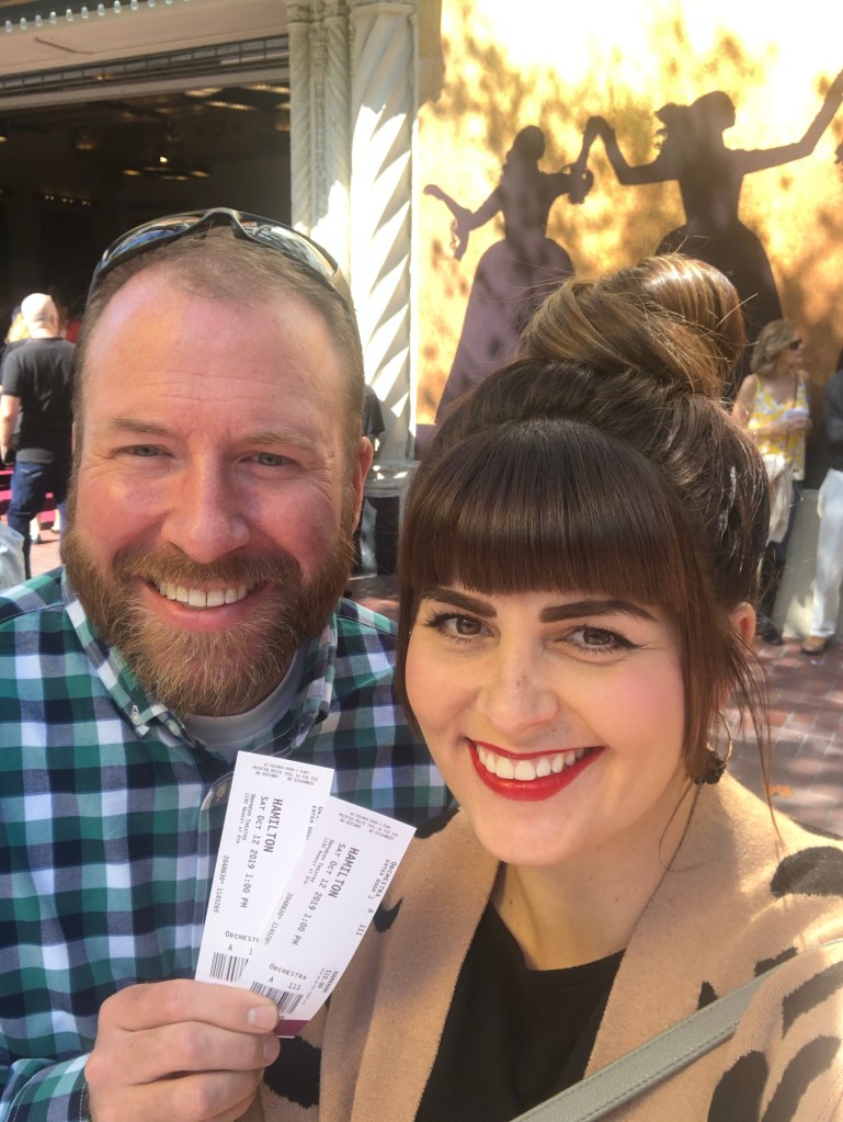 Every day since Hamilton started a residency in San Francisco, I would play the lottery. It was part of my daily routine. Wake up, brush teeth, play the lottery. One day after months and months of playing, I got the email that I actually won two tickets! FOR TEN DOLLARS EACH. They give you 24 hours notice, so it was for the following matinee. We figured out child care asap, I’m pretty sure I would have abandoned my kids on the side of the road to make that show.