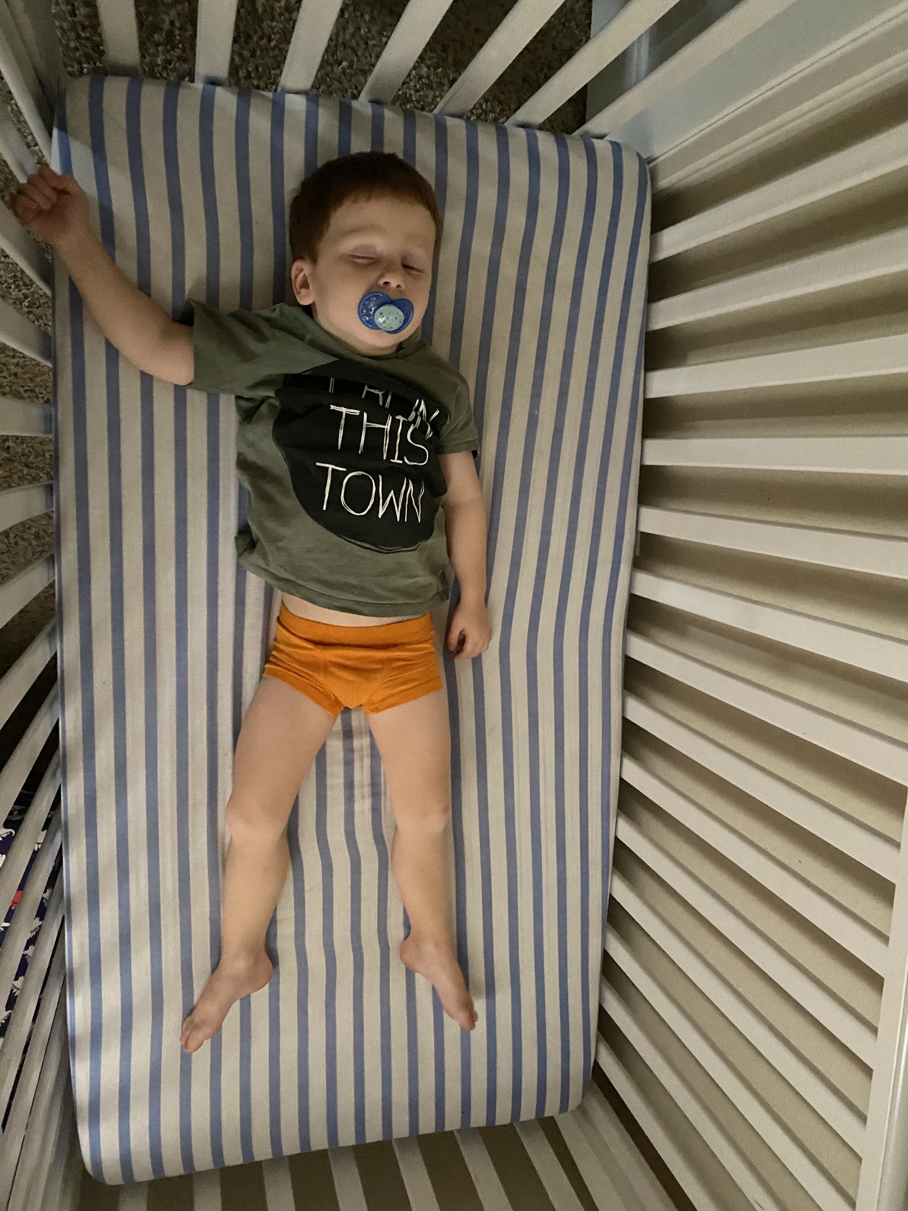 Also, if I had a dollar for every photo I have of one of my kids sleeping… I’d be able to fly into space like Jeff Bezos. They just look so sweet and peaceful, I miss the paci face days. (Not that much, he’s practically five now.) He loved to just chill in his sleepy sack after his naps too so he would like walk around in a sleeping bag and wear holes in the bottom. His little giraffe that he calls “One Baby” has a rattle in it, so I can always hear Thatcher coming before I see him. He still loves the taggy on the giraffe- he rubs it between his fingers. When he was a baby he did it so much he would get little sores on his skin! Now that he isn’t napping and he is so tired at night, he basically passes out. Love him so much.