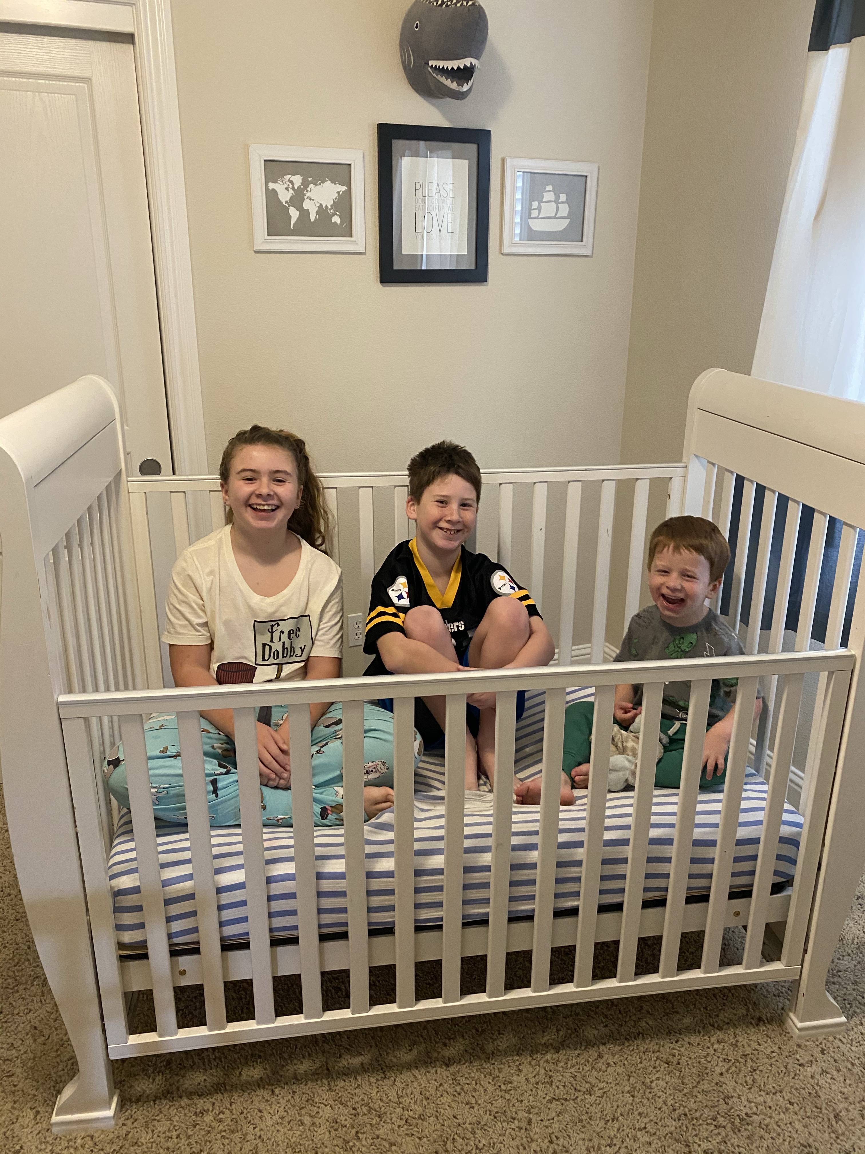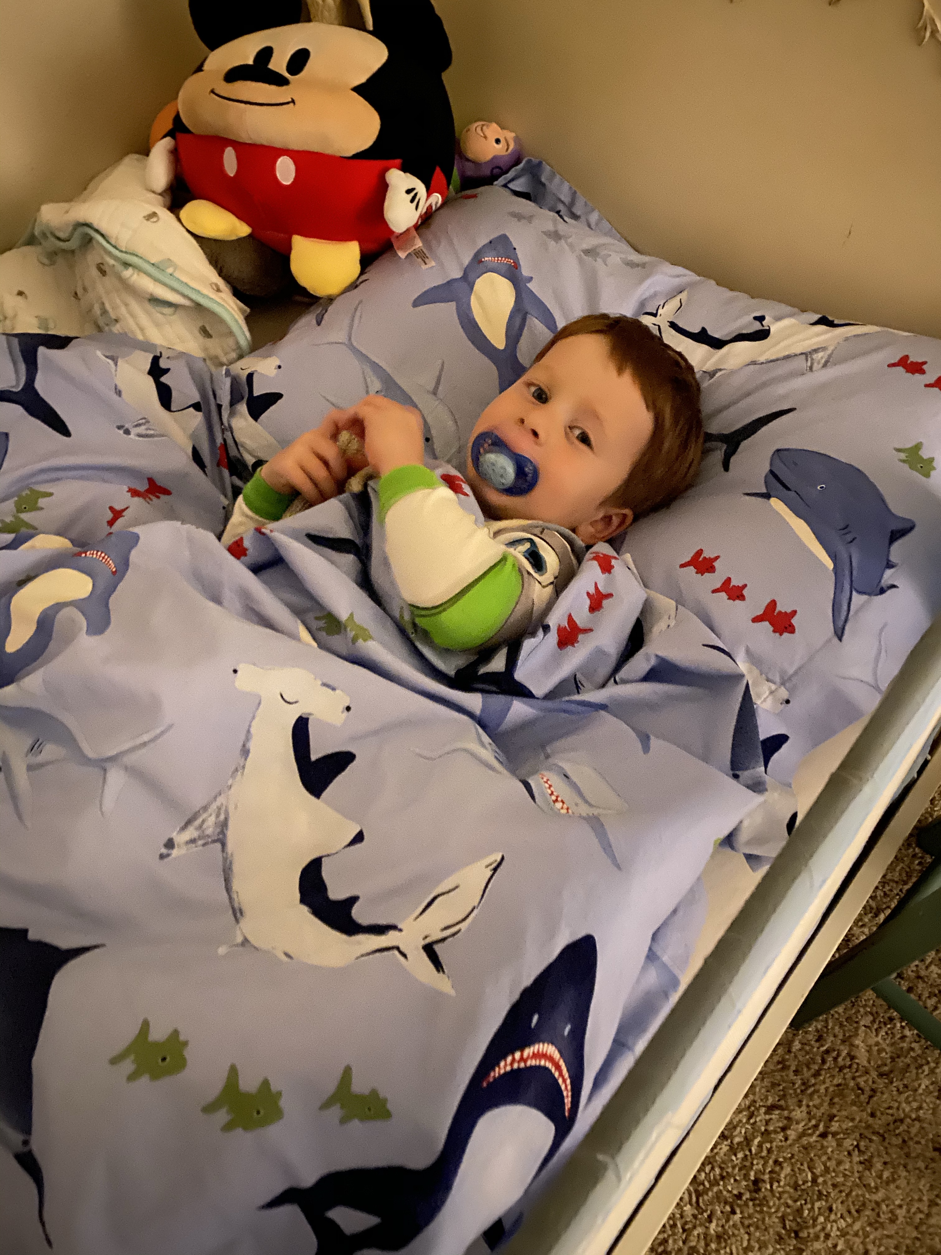 Alright, on to January. We took the crib down. I told Jazz to get rid of it as it seemed we were done with babies. He stuck it in the storage unit, bless him, and we will use it again with this new baby. I have hovered over that crib for so many nights! Thatch moved into a twin size bed with shark bedding. He loves sharks.
