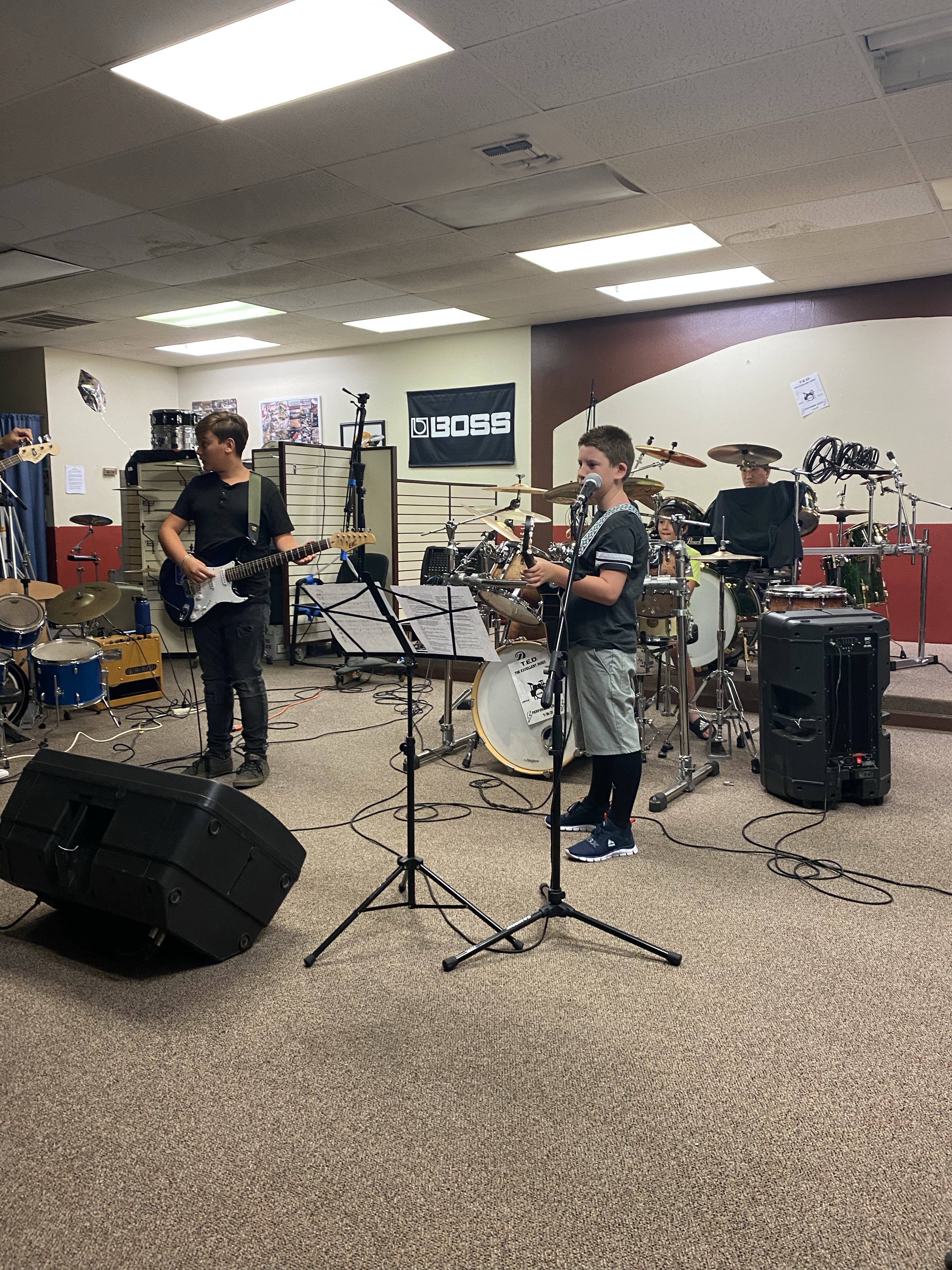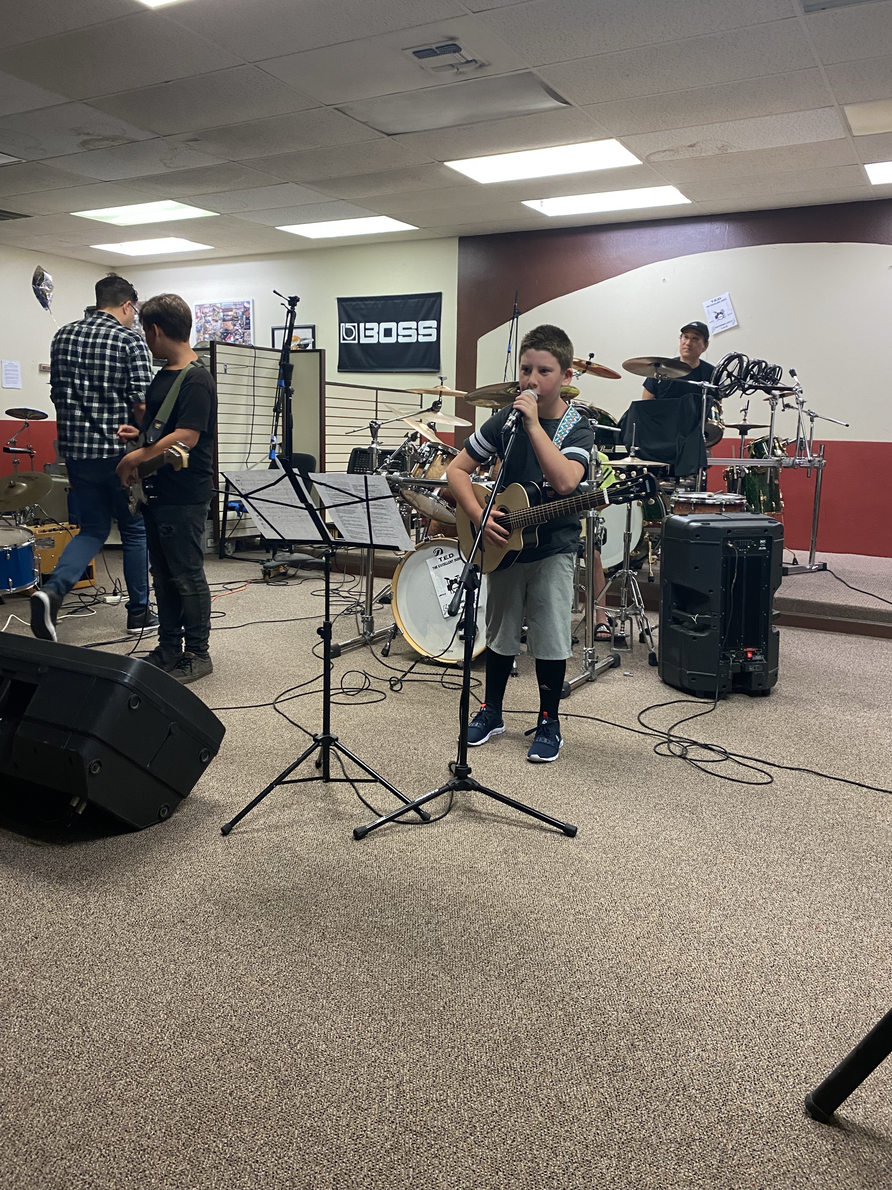 Linc has been taking guitar lessons for almost a year (Novemberish?). I love his guitar teacher, he totally speaks Lincoln’s language and plus he comes to my HOUSE for lessons each week. In July he did a band camp with a couple other kids- a drummer and another guitar player- and at the end of the week they had a little set for us to come and watch.
